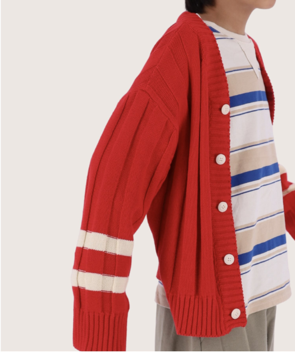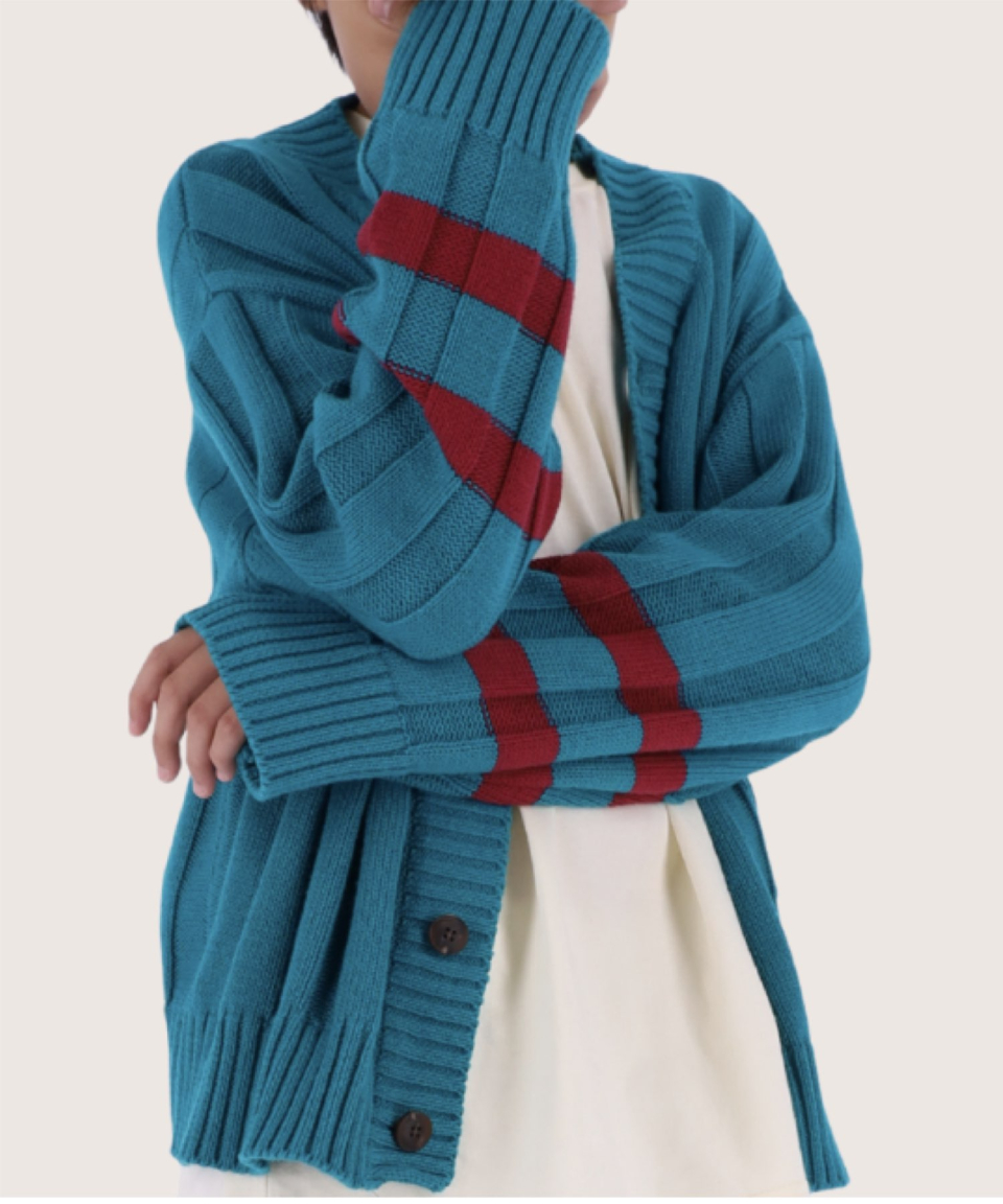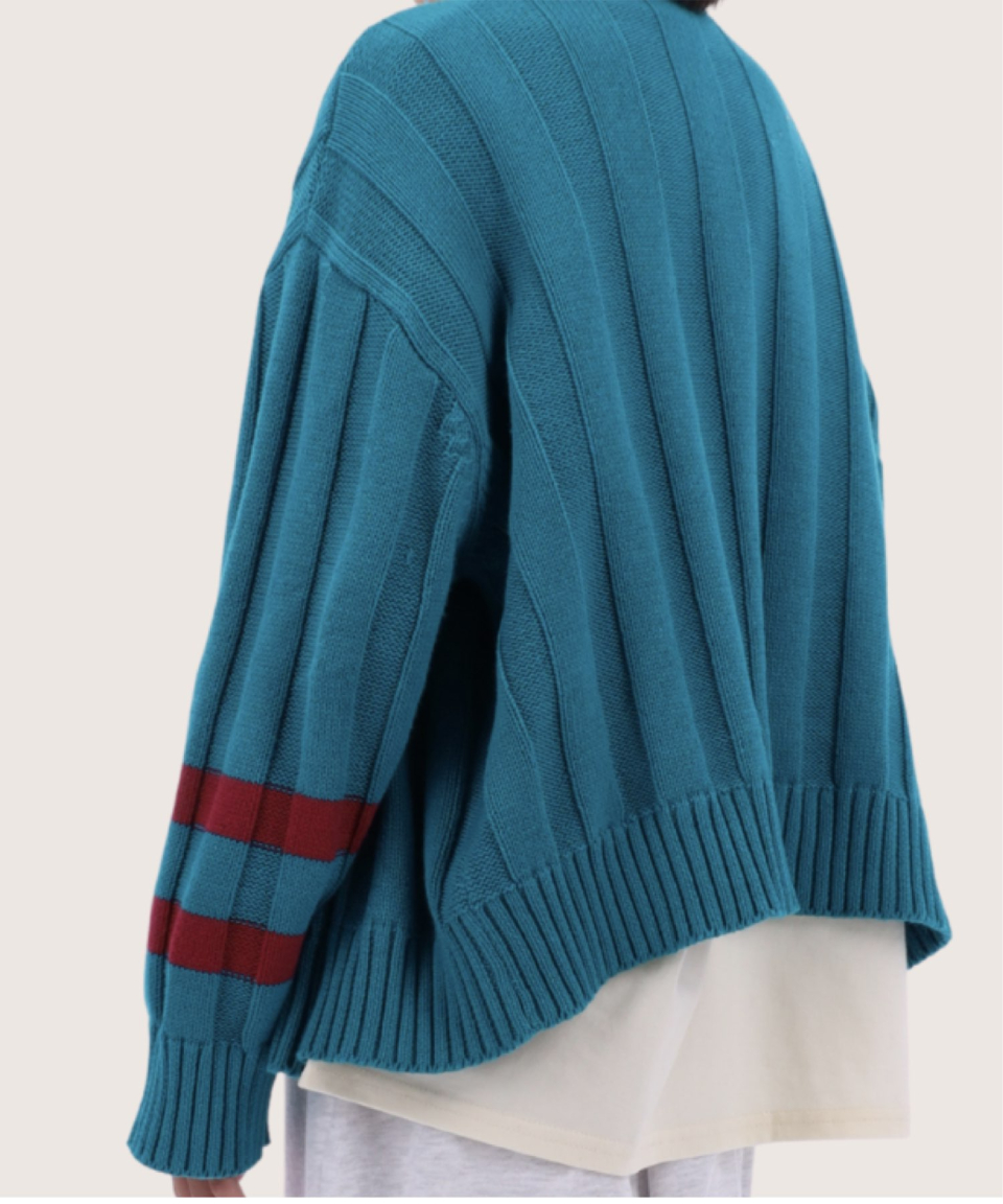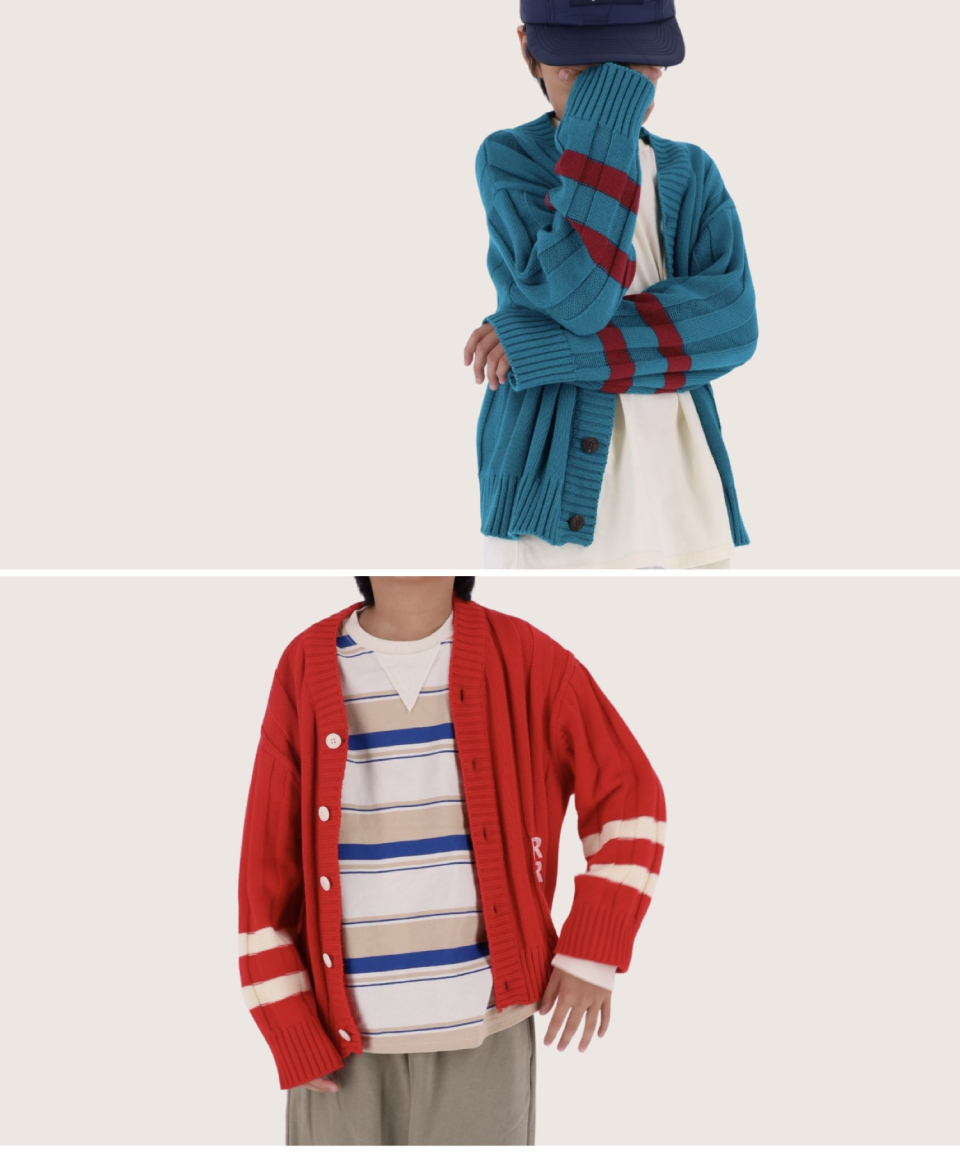 폴인 오버사이즈 스트라이프 니트 가디건 레드,틸블루