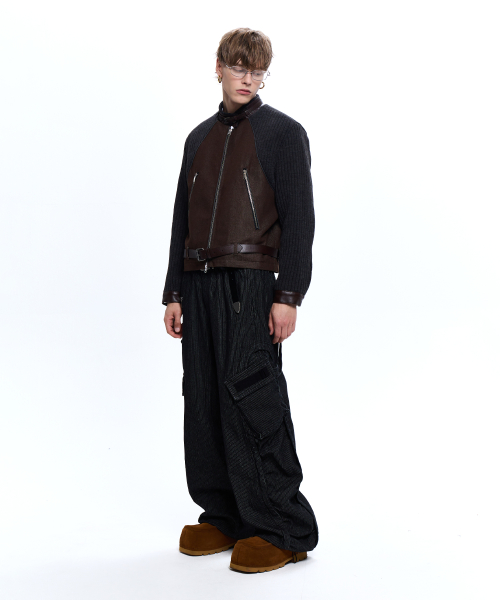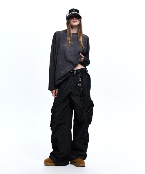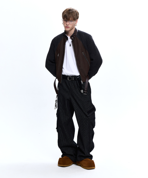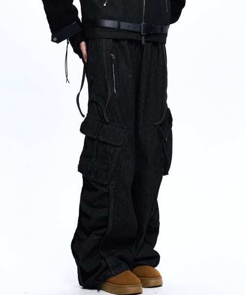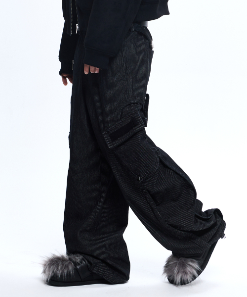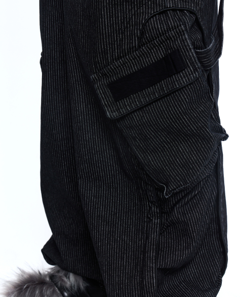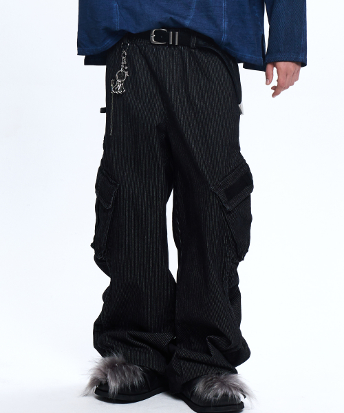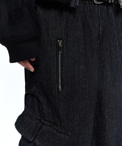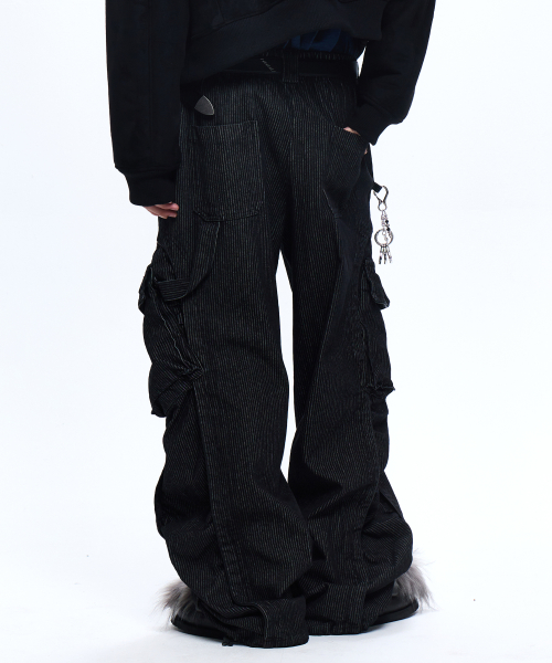 STRIPE MIXED CARGO DENIM PANTS - BLACK