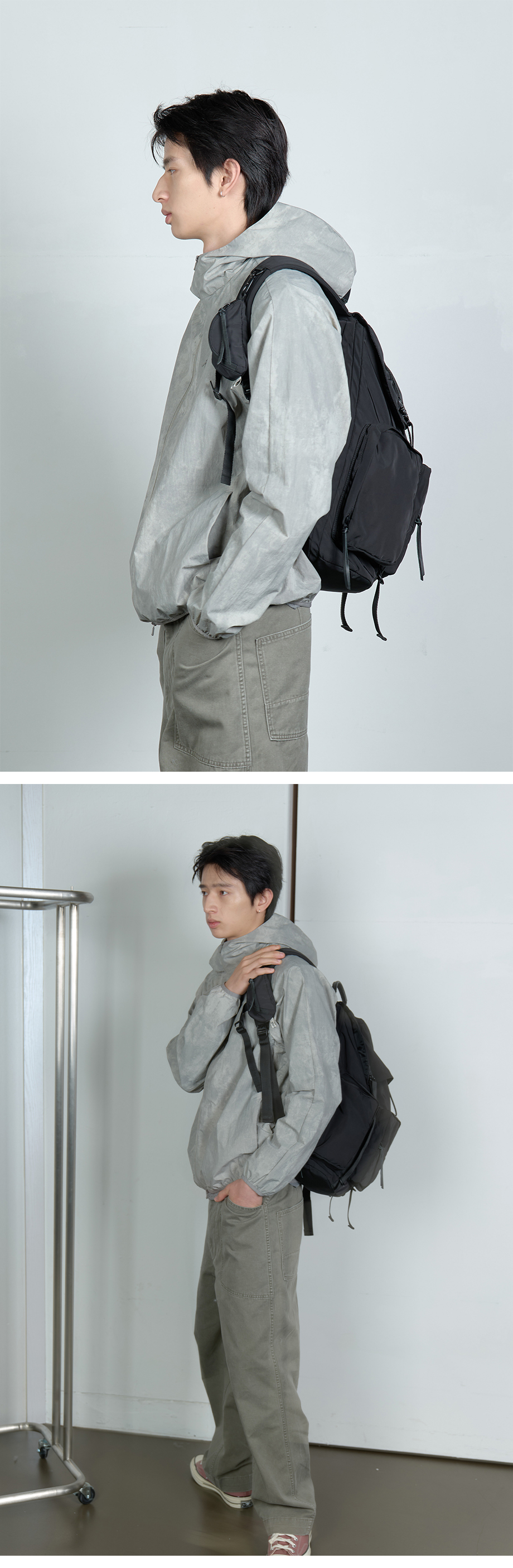 제품 특성상 세탁 진행 시 원단의 생활 방수 기능 저하, 형태 변형, 고리 및 장식 손상 등의 현상이 발생할 수 있어 세탁을 권장드리지 않습니다.