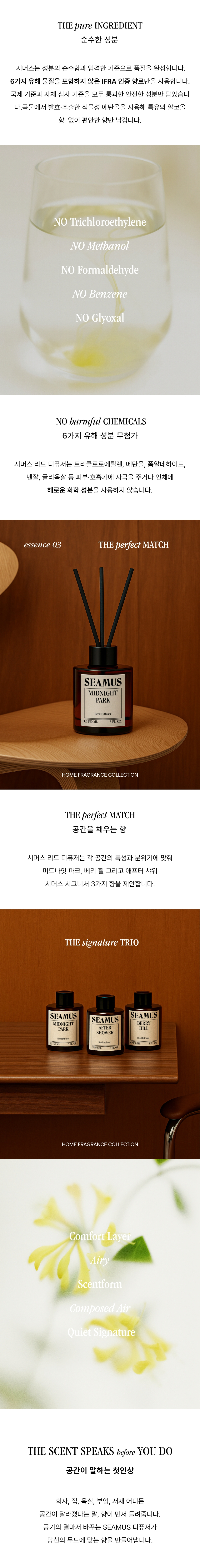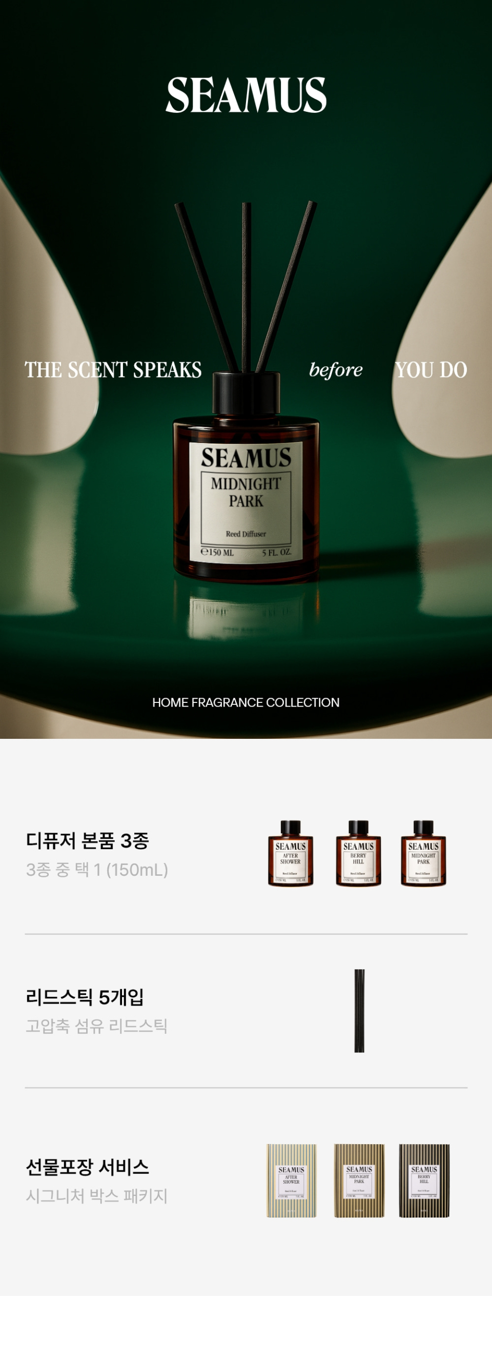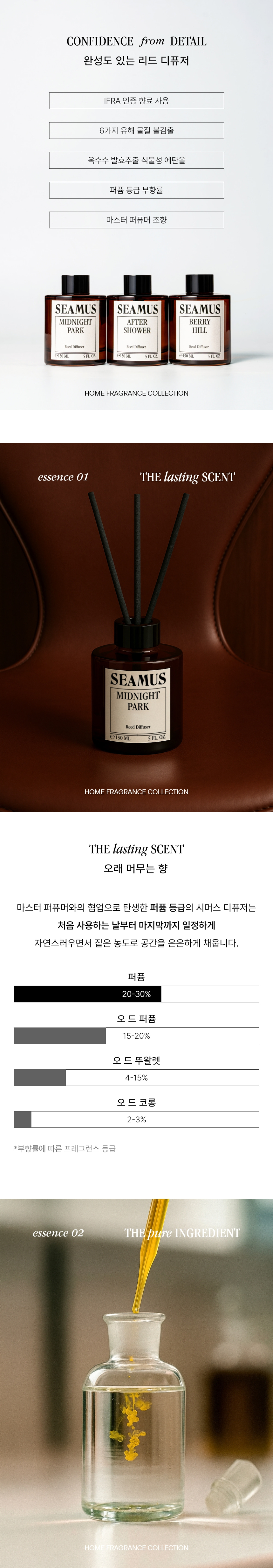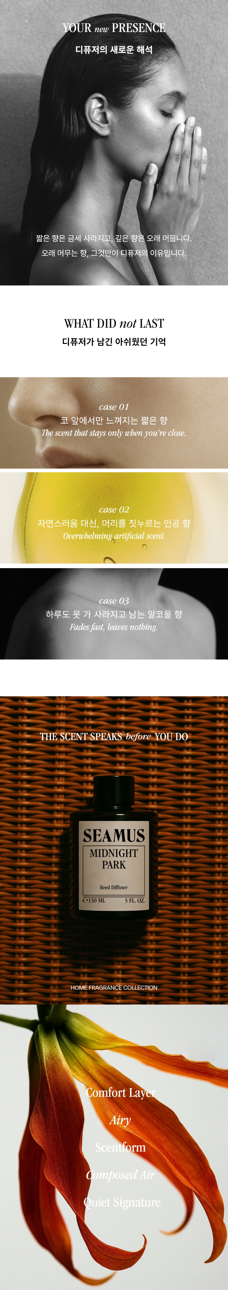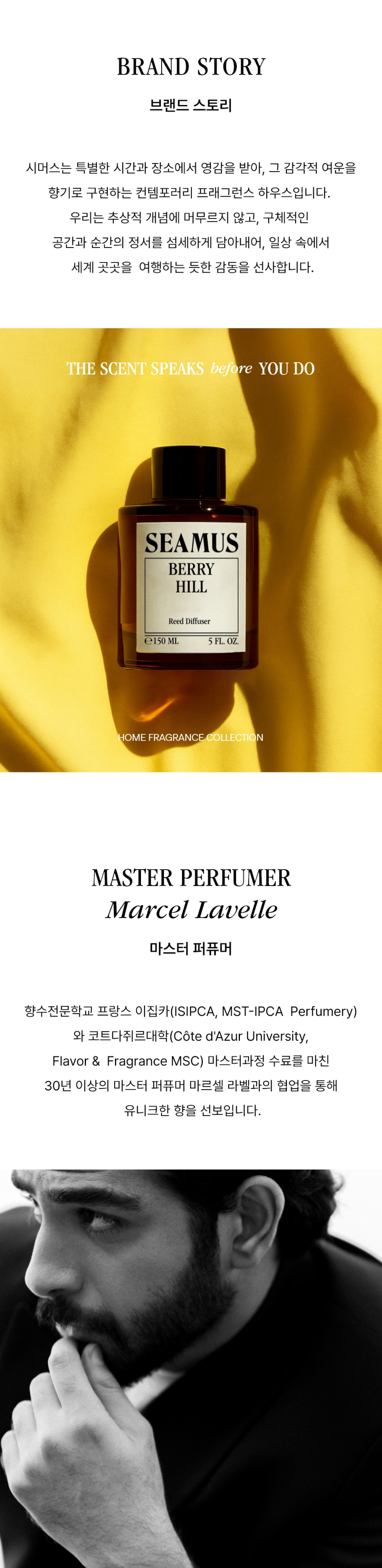 시머스(SEAMUS)는 니치 프래그런스 하우스로, 일상 속 특별한 순간을 향기로 채우는 것을 목표로 하는 브랜드입니다. 향수가 갖춰야 하는 품질과 본질적인 예술성을 중시하며, 섬세하게 조향된 향으로 소비자에게 특별한 감각 경험을 제공합니다.