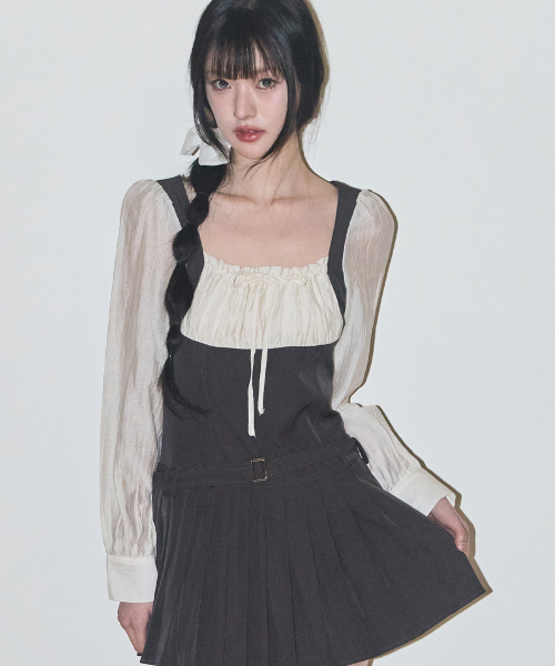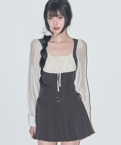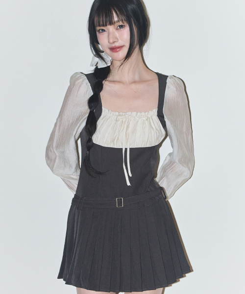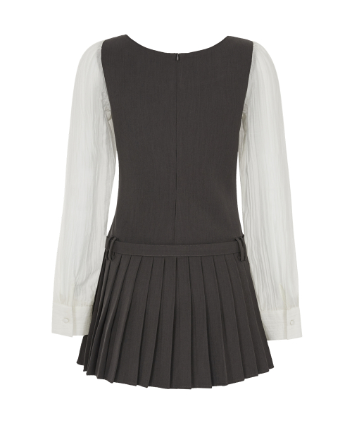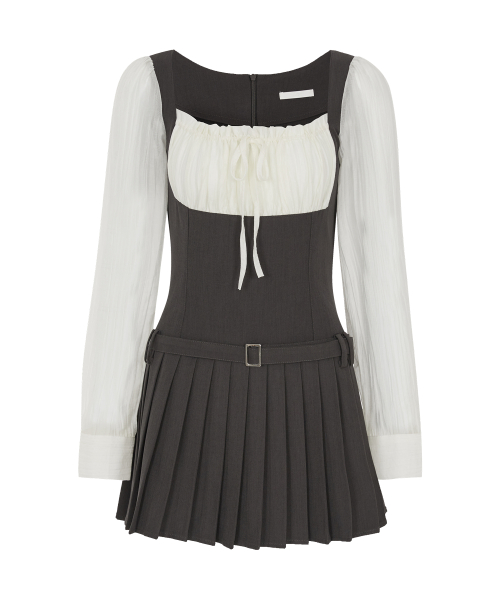 프레피 리본 플리츠 원피스 차콜