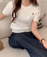 라운드넥 케이블 하트자수 반팔 니트