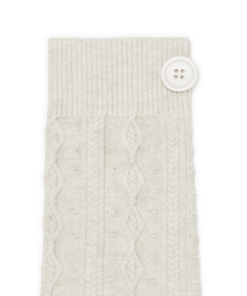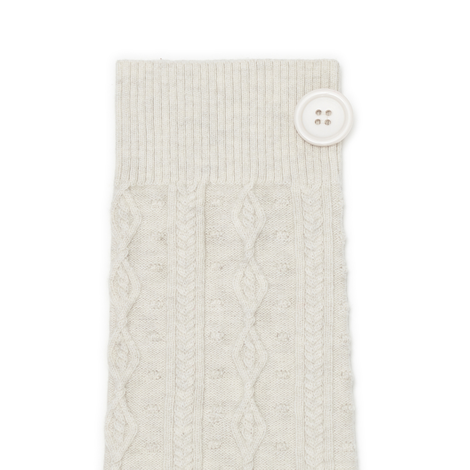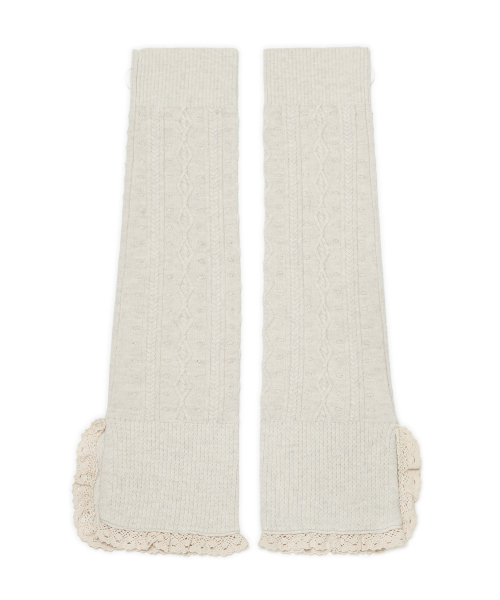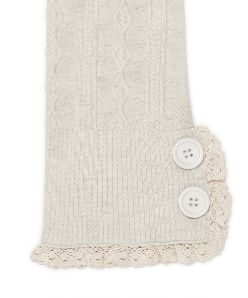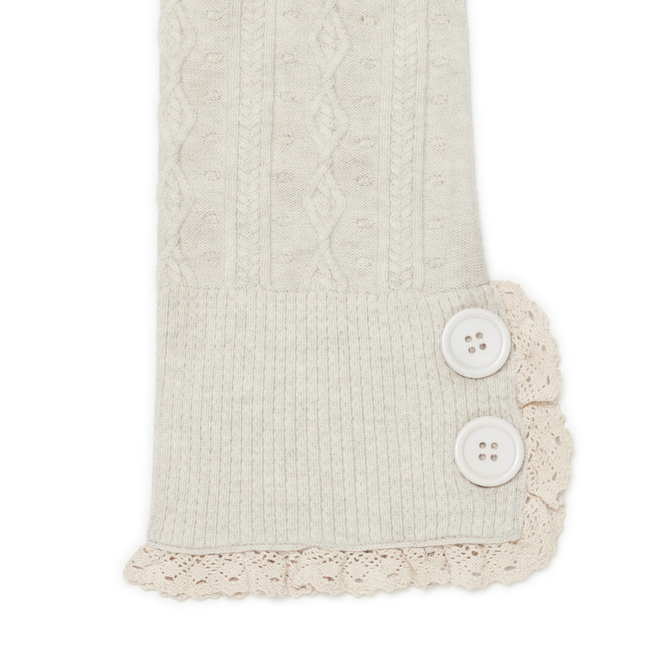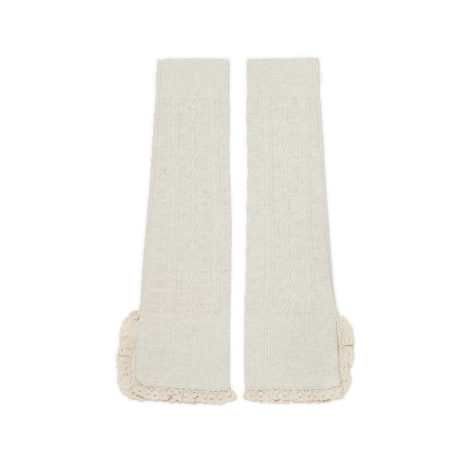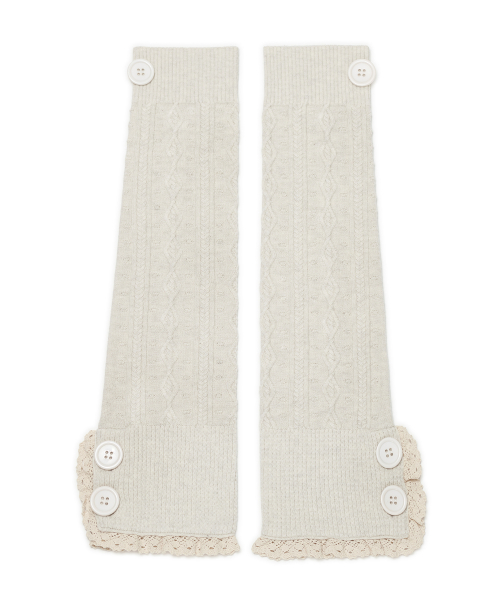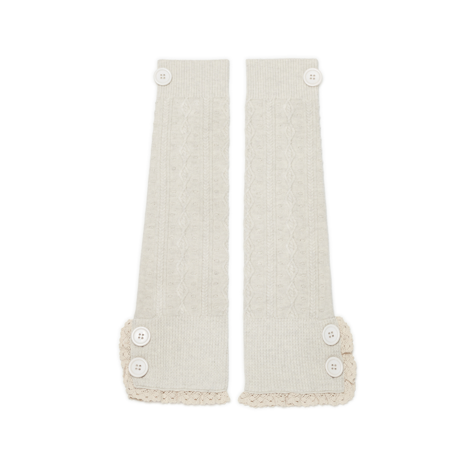 레이스 트리밍과 버튼 디테일로 빈티지 무드를 더한 케이블 니트 레그워머