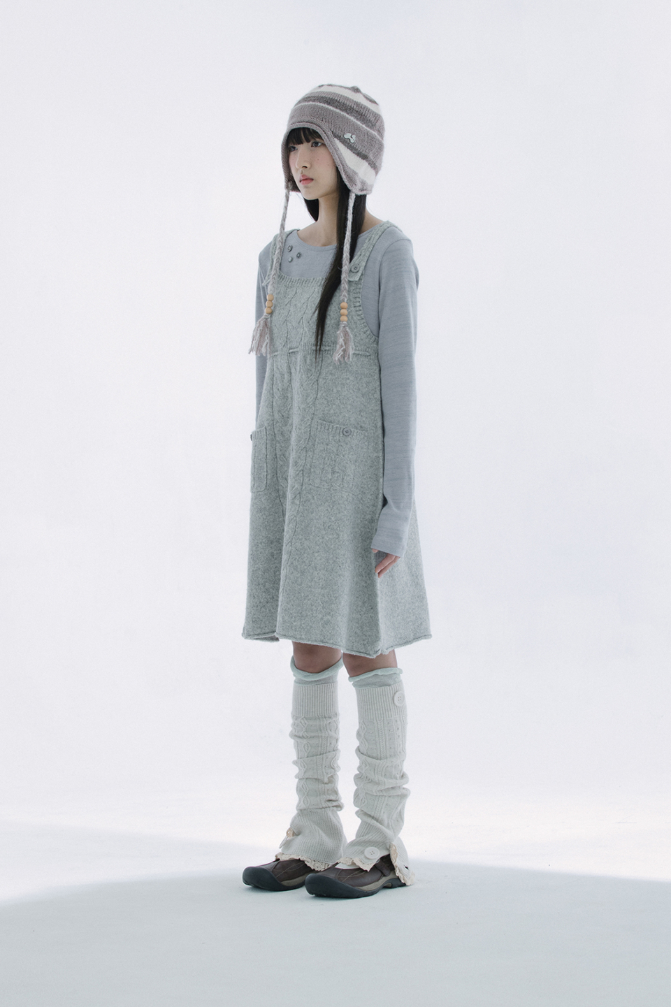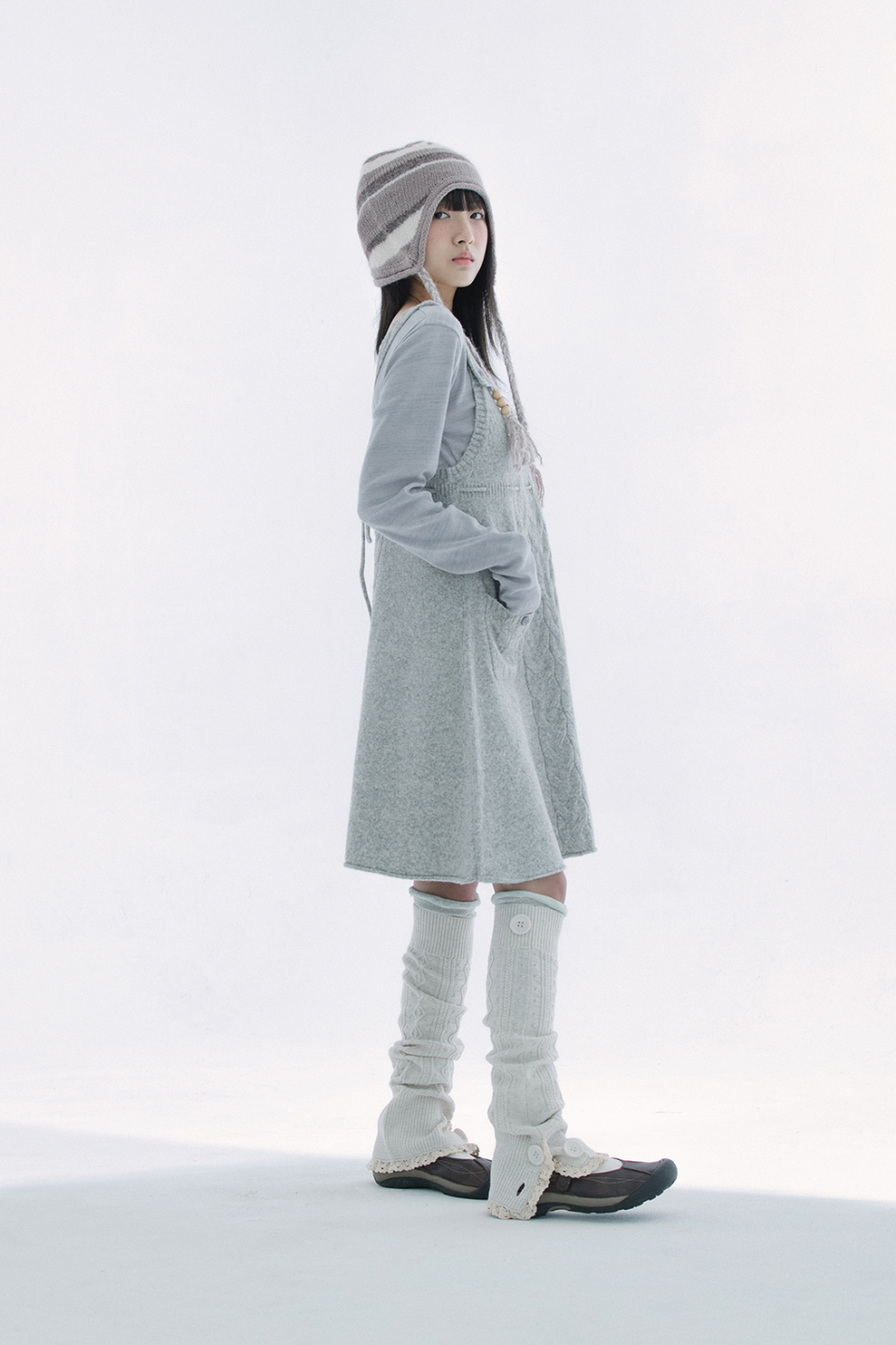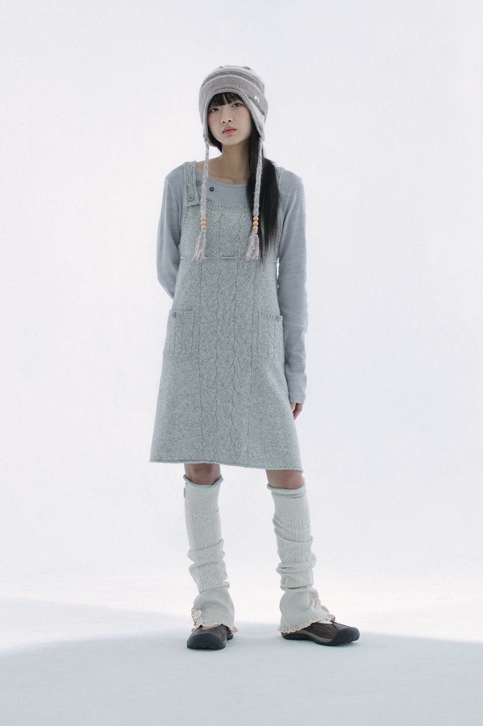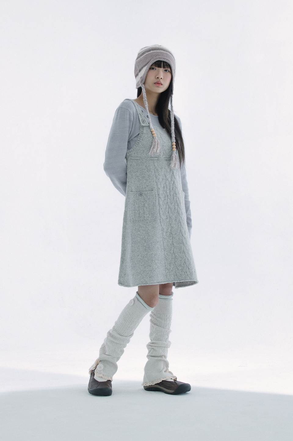 레이스 트리밍과 버튼 디테일로 빈티지 무드를 더한 케이블 니트 레그워머