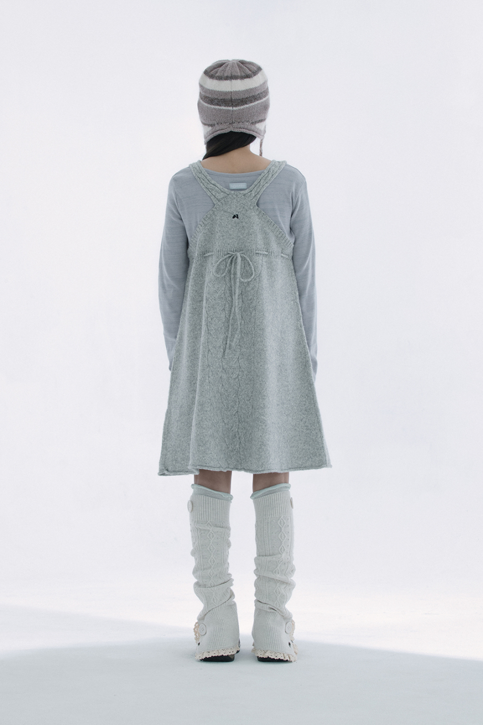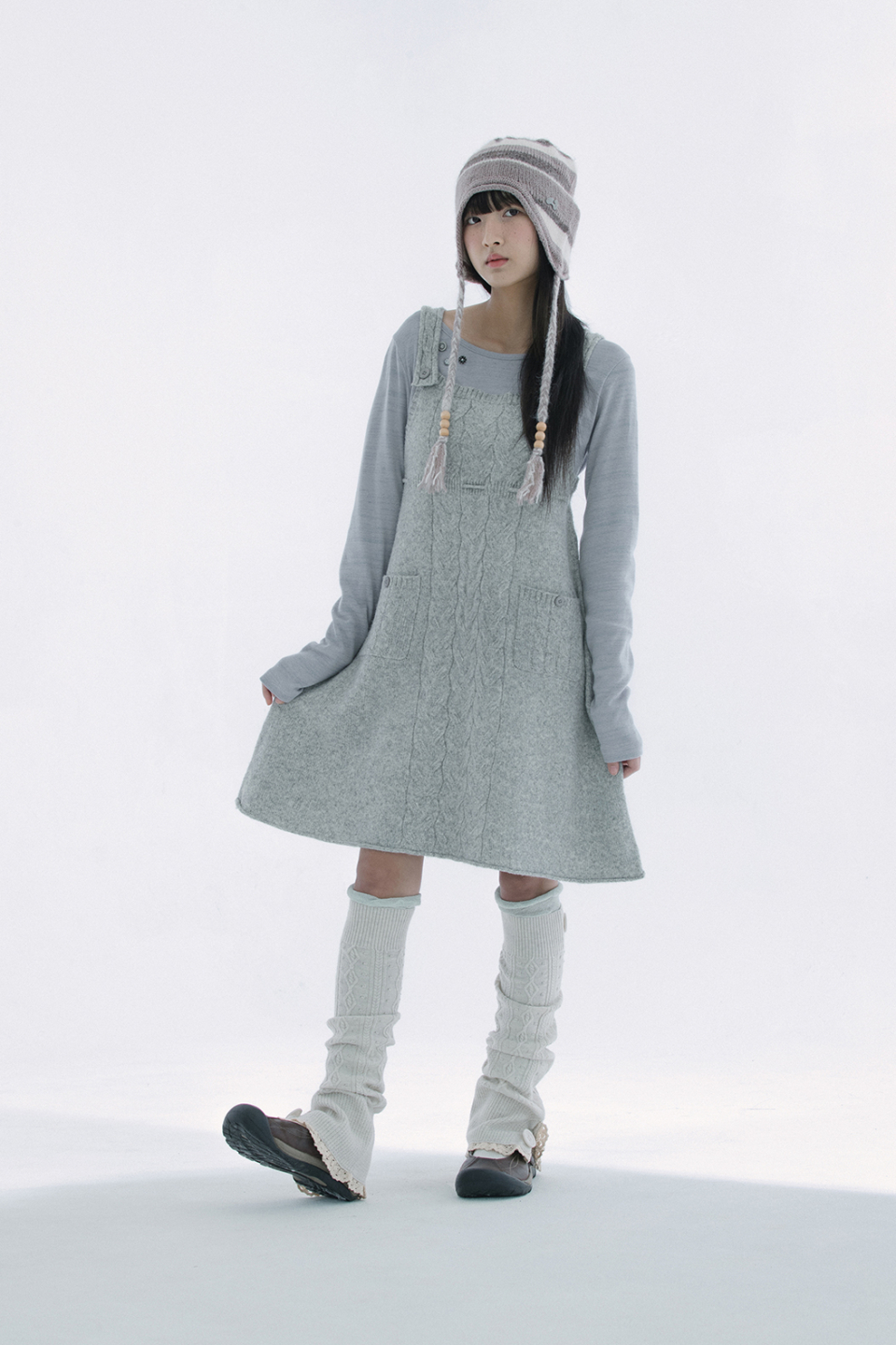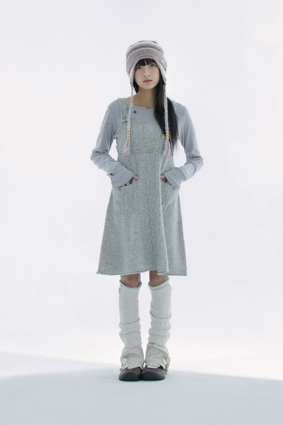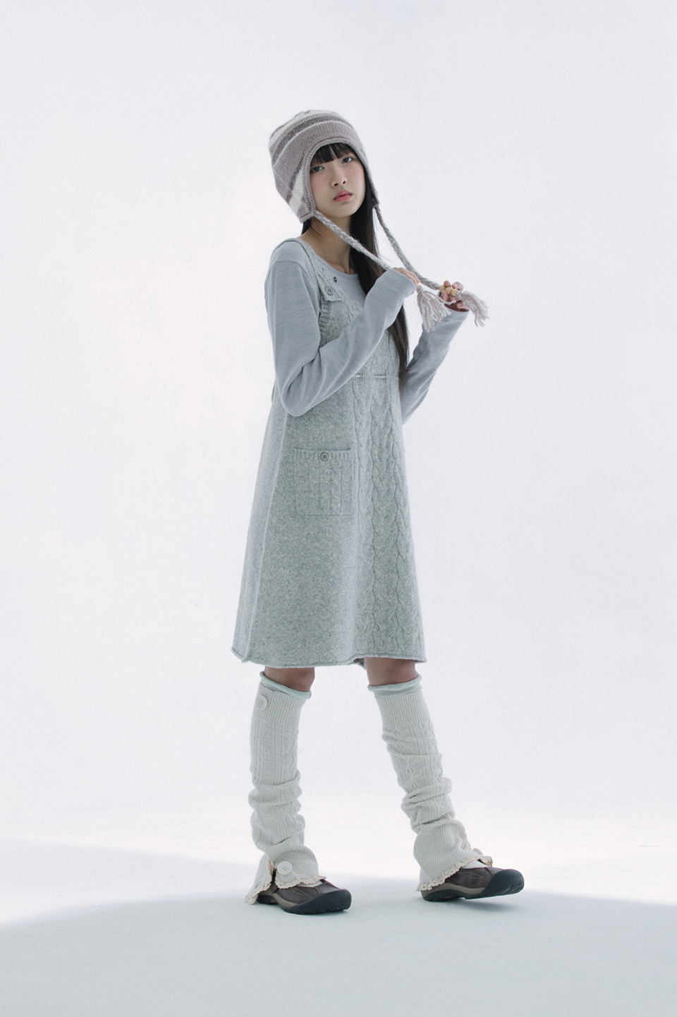 레이스 트리밍과 버튼 디테일로 빈티지 무드를 더한 케이블 니트 레그워머