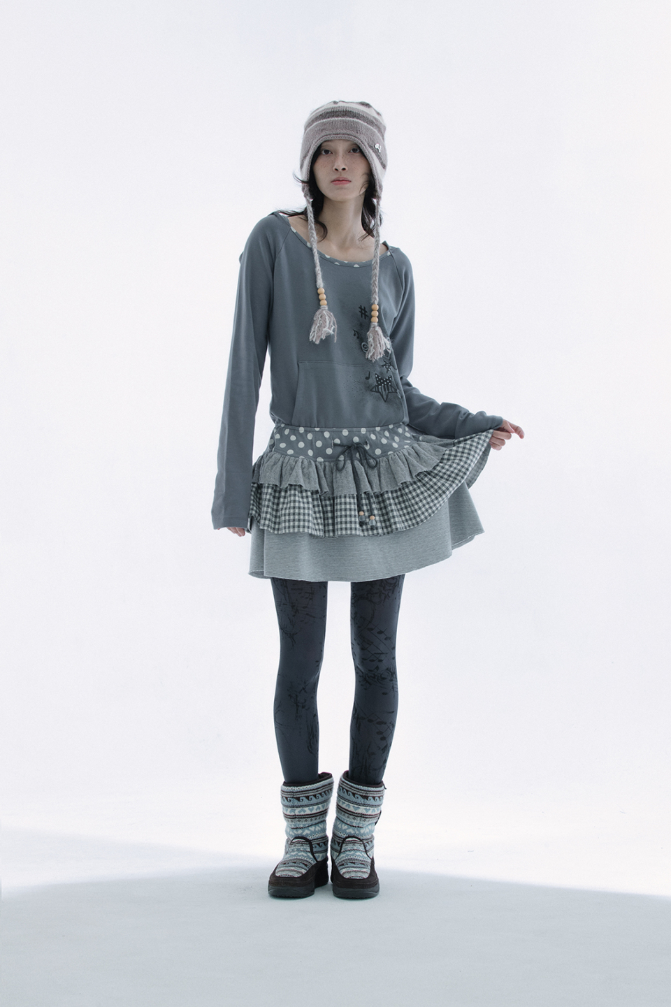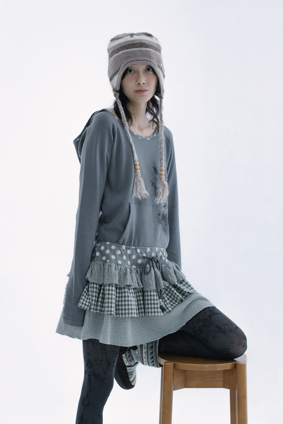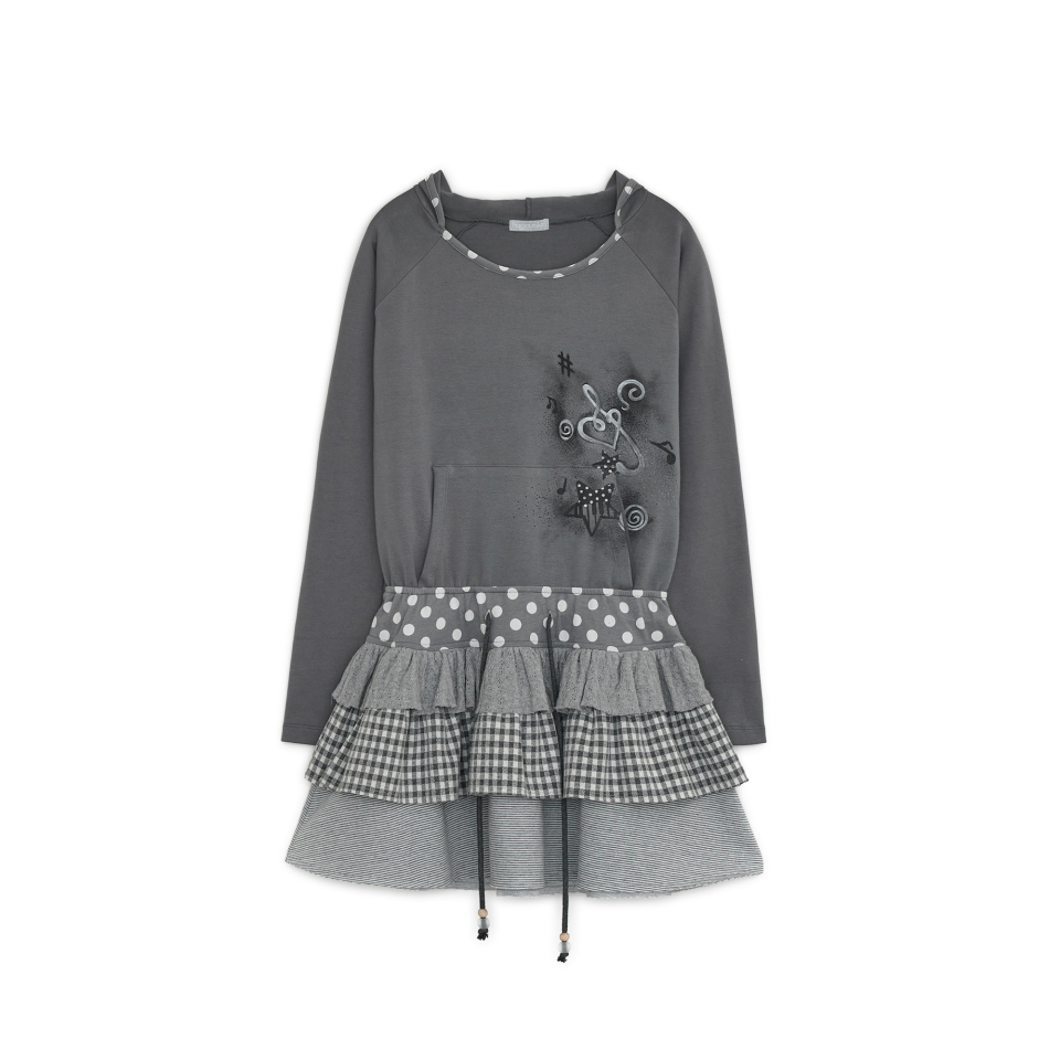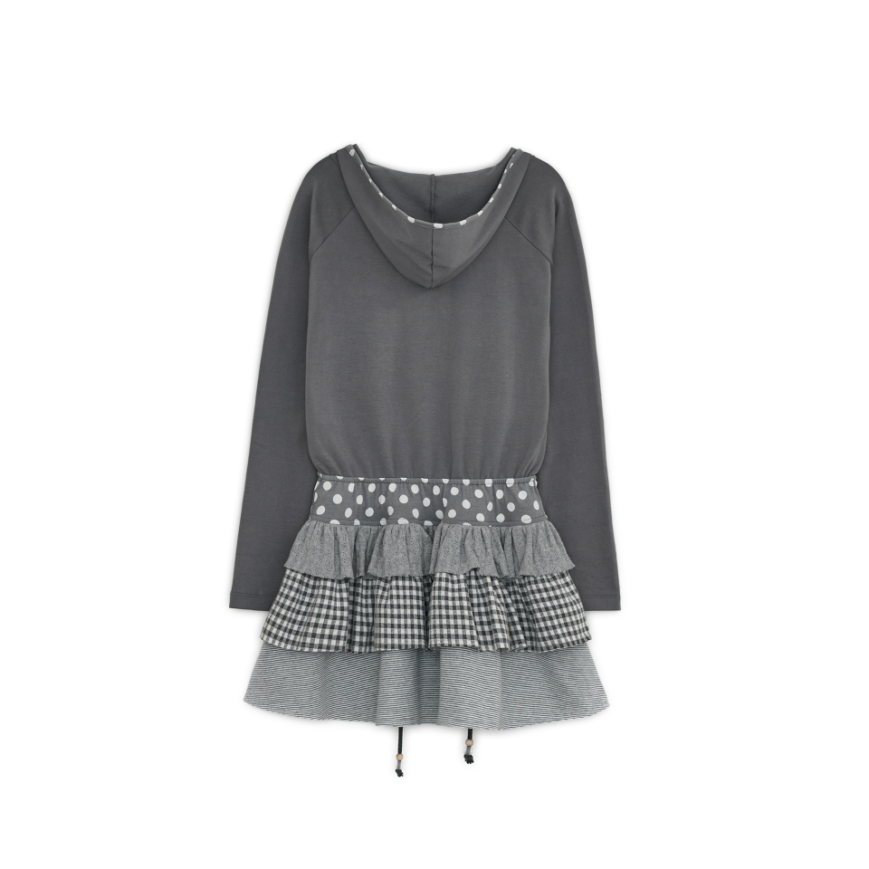 여러 패턴의 층이 레이어드되어 빈티지 무드를 더한 후드 원피스