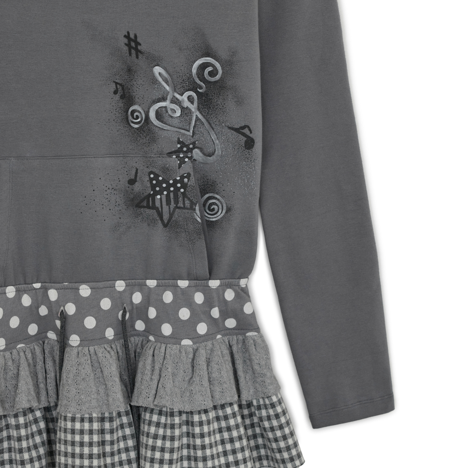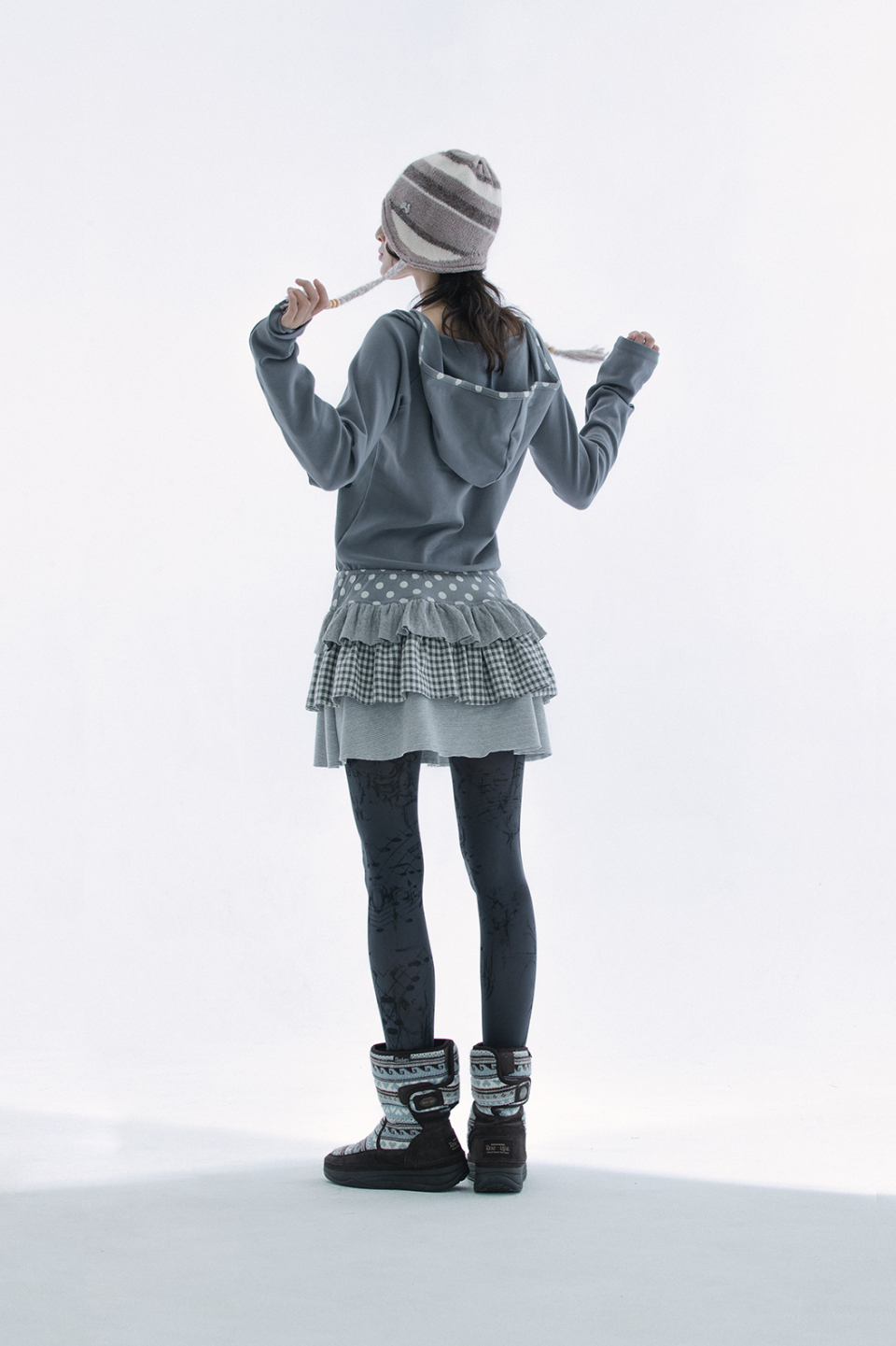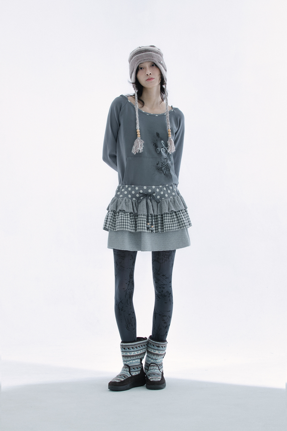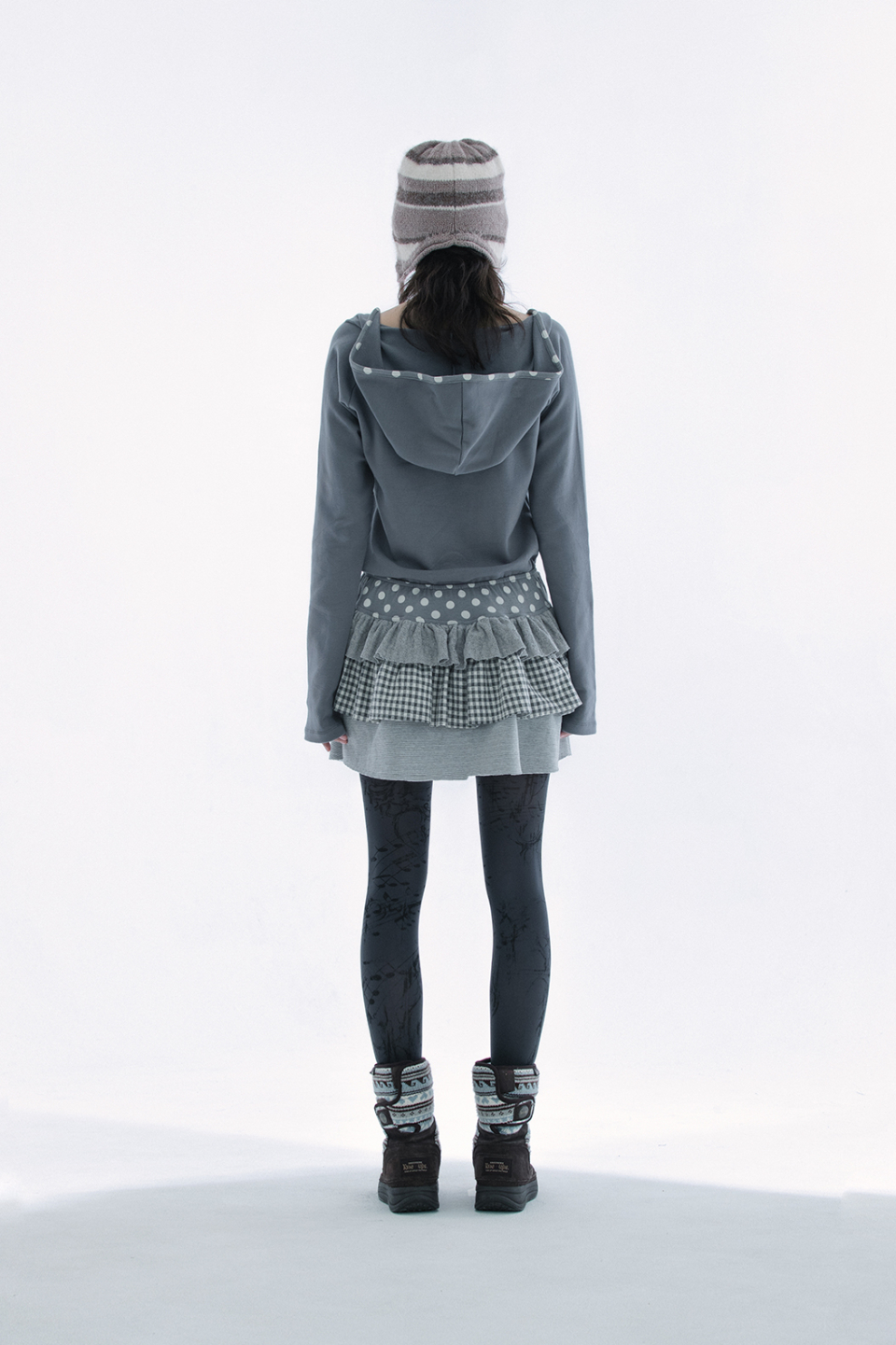여러 패턴의 층이 레이어드되어 빈티지 무드를 더한 후드 원피스