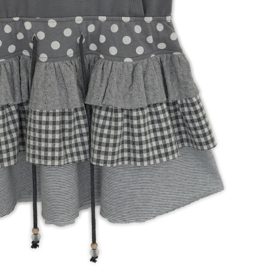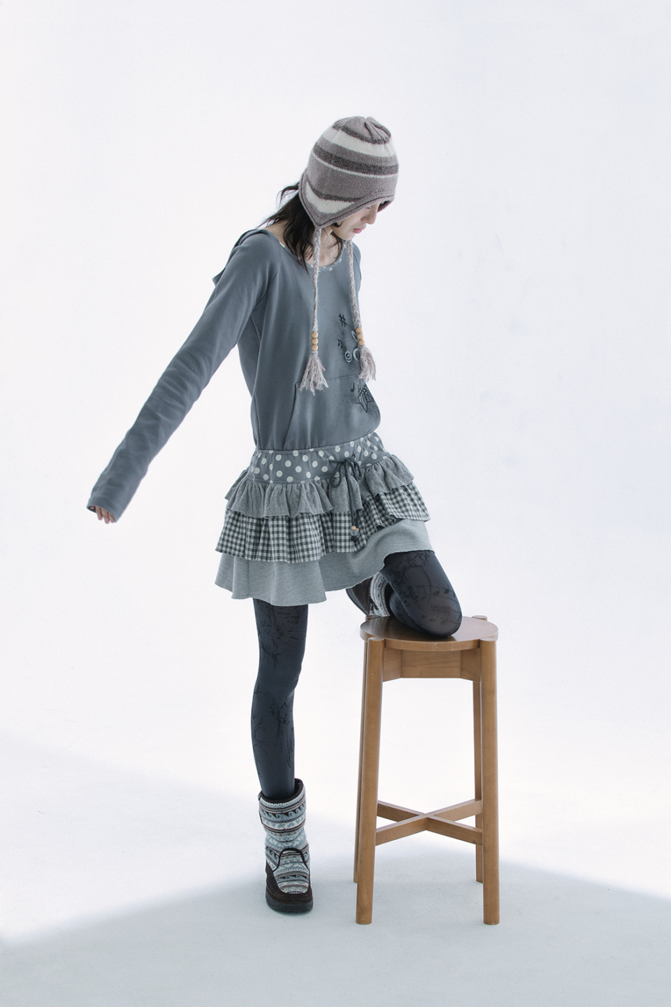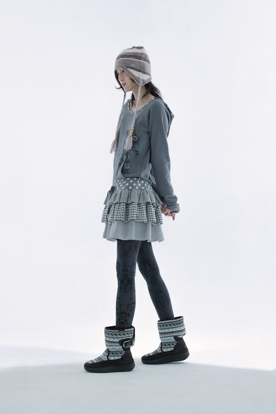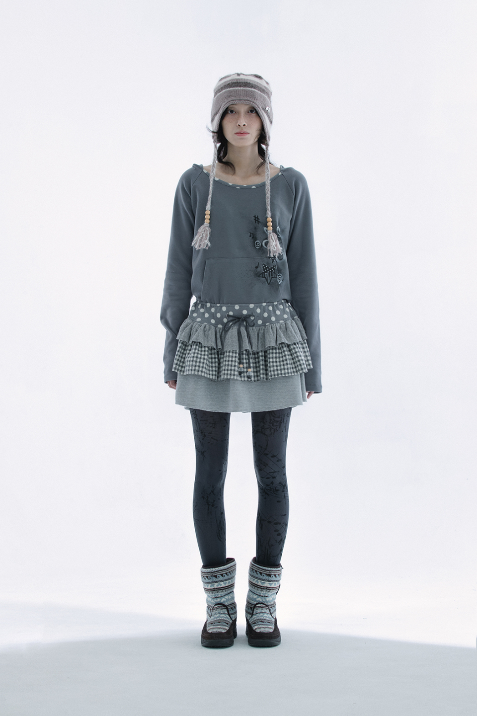 여러 패턴의 층이 레이어드되어 빈티지 무드를 더한 후드 원피스