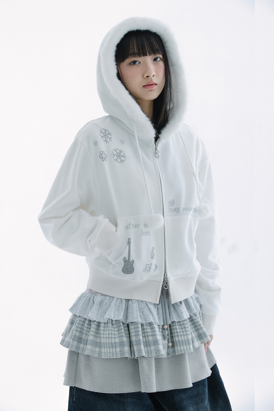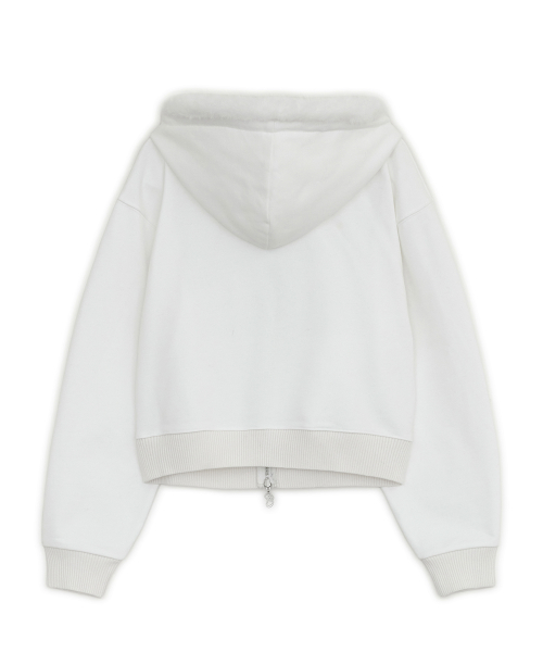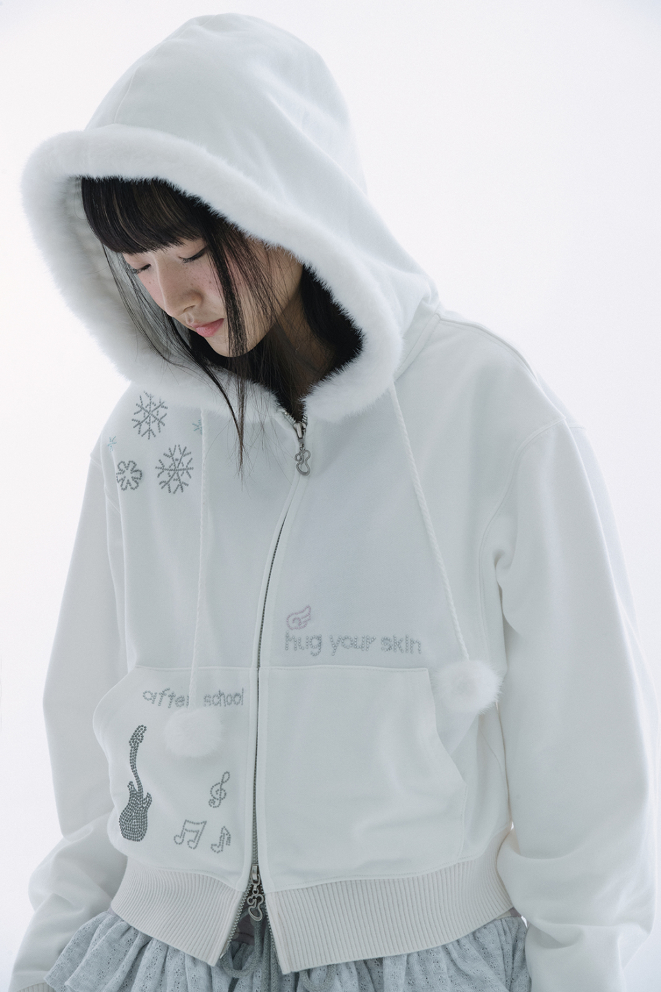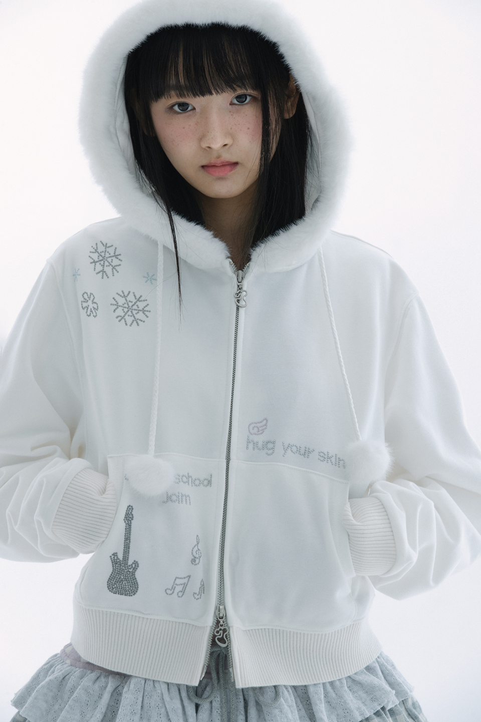 * 후드에 퍼 트리밍 디테일과 조절 가능한 퍼 폼폼 스트링 디테일