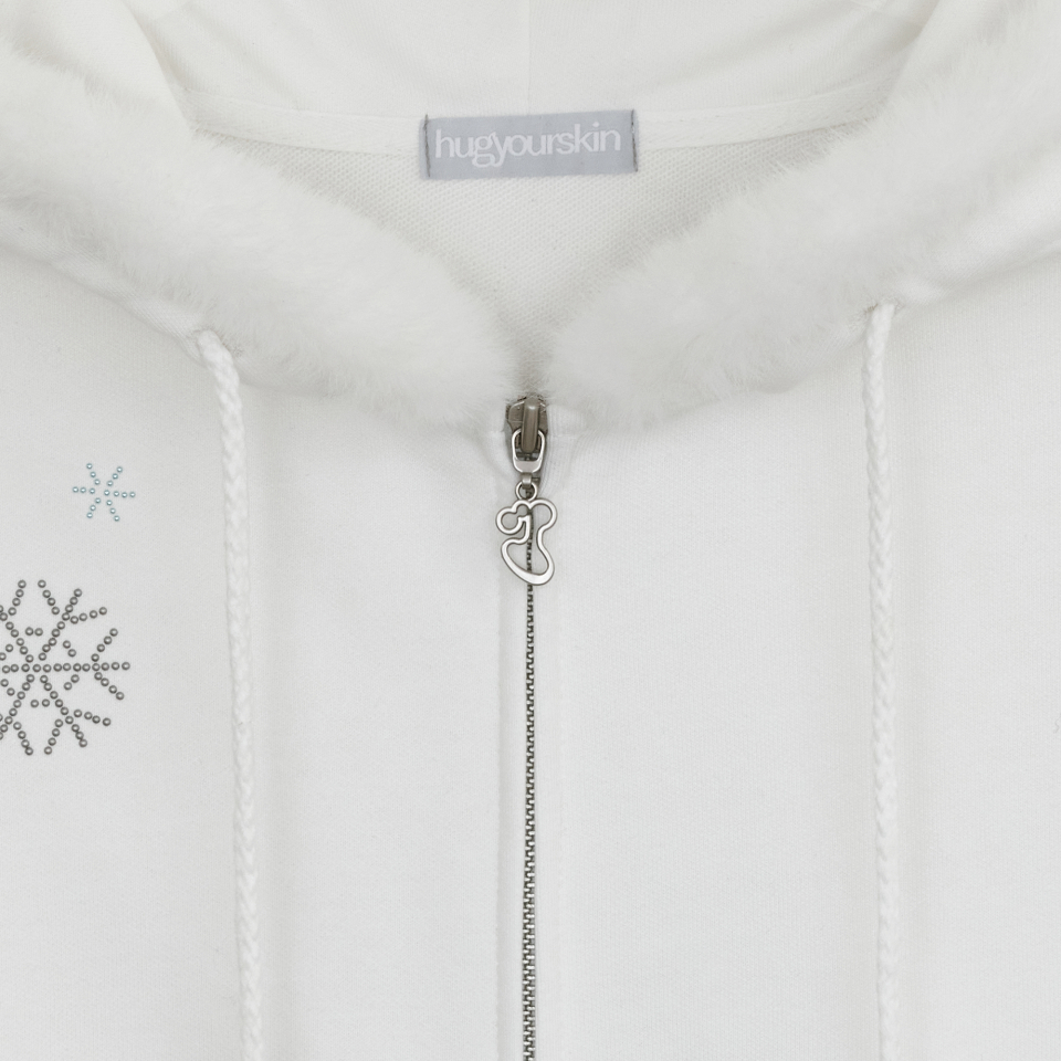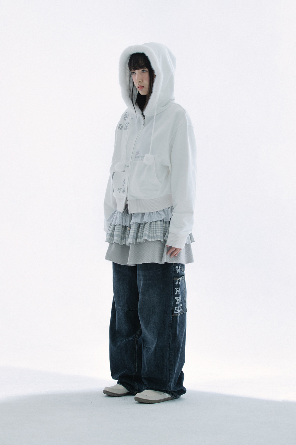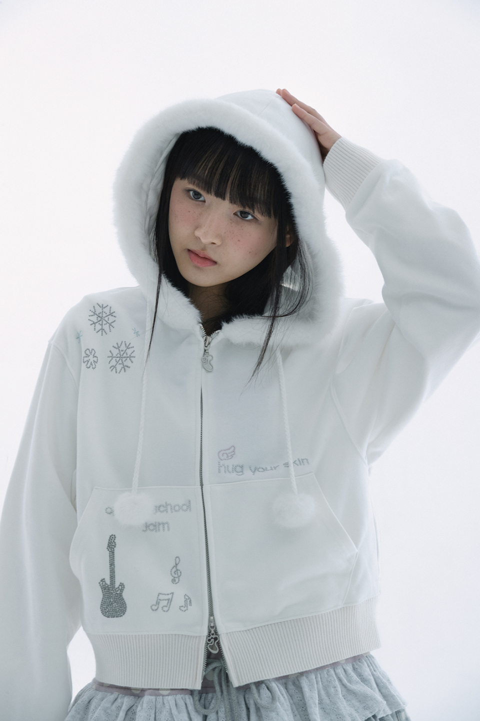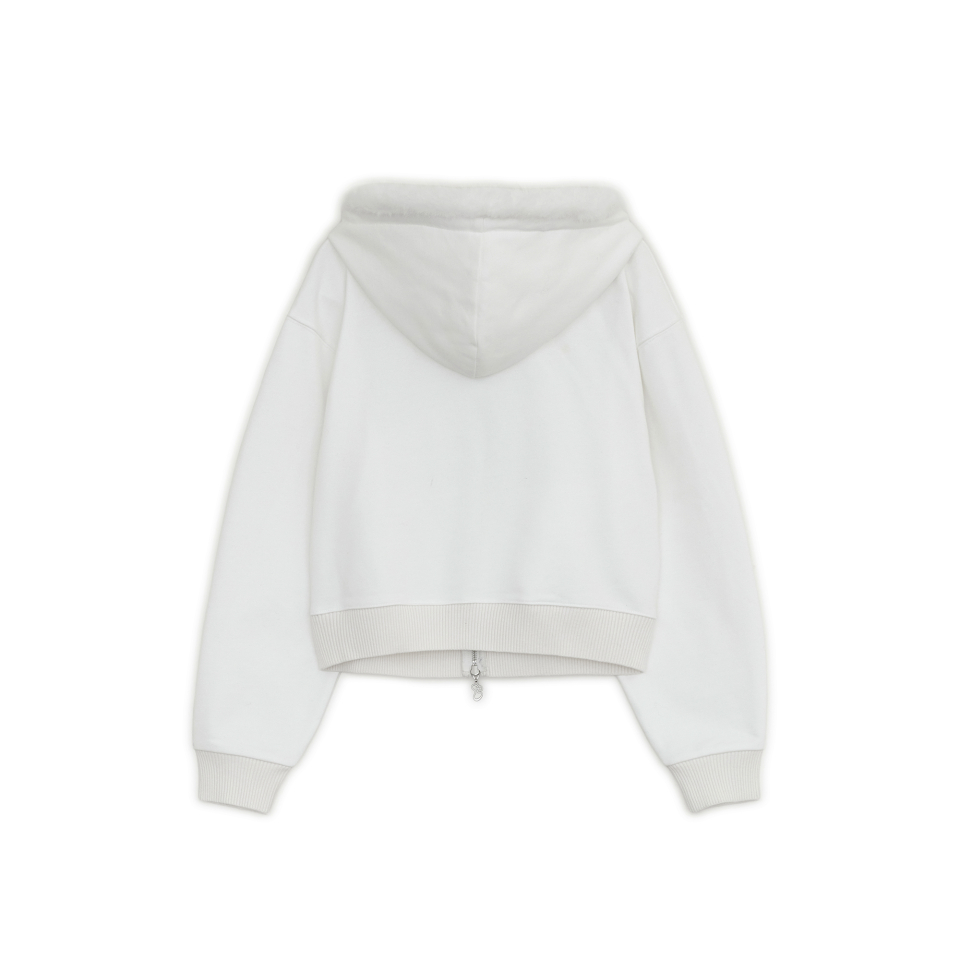 * 후드에 퍼 트리밍 디테일과 조절 가능한 퍼 폼폼 스트링 디테일