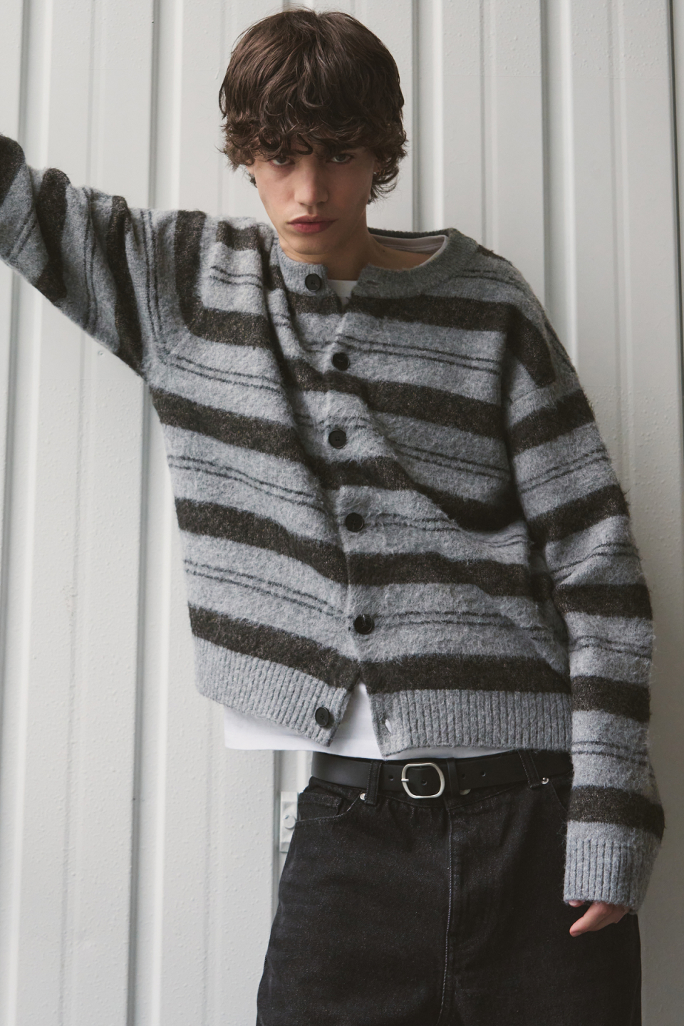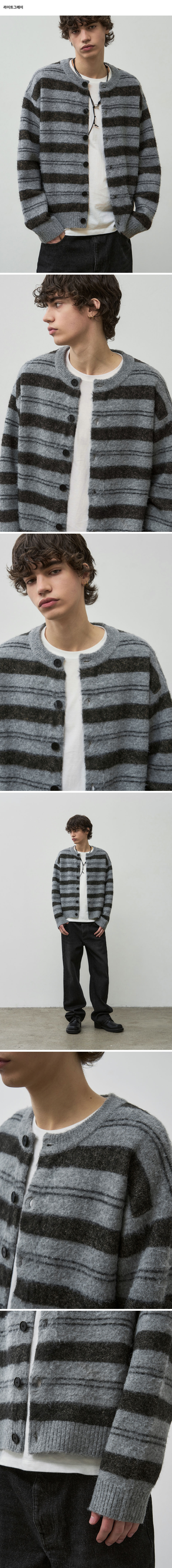 헤어리 스트라이프 크롭 니트 가디건 [딥그레이]