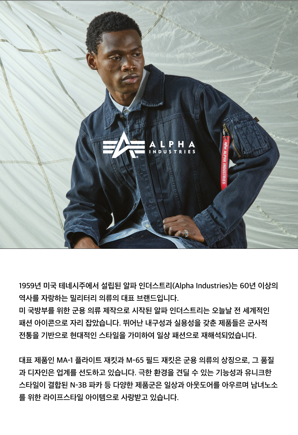 알파 인더스트리(ALPHA INDUSTRIES)는 1959년 테네시주 녹스빌의 한 공장에서 시작한 브랜드입니다. 미국의 육·해·공군 및 해병대원을 보호하는 플라이트 재킷이나 코트를 제공하는 공식 공급업체(오피셜 서플라이어)로 엄격한 밀스펙(군대에서 정해 놓은 기준)을 엄수하며 생산합니다. 특히 알파 인더스트리는 다른 업체와 달리 군수품과 일반인에게 판매되는 재킷에 등급의 차이가 없습니다. 알파 인더스트리의 제품은 미국은 물론 전 세계 각지의 미군 기지에서 활동하는 군인이나 파일럿, 지상 요원이 입는 재킷과 같은 그레이드의 아이템입니다.