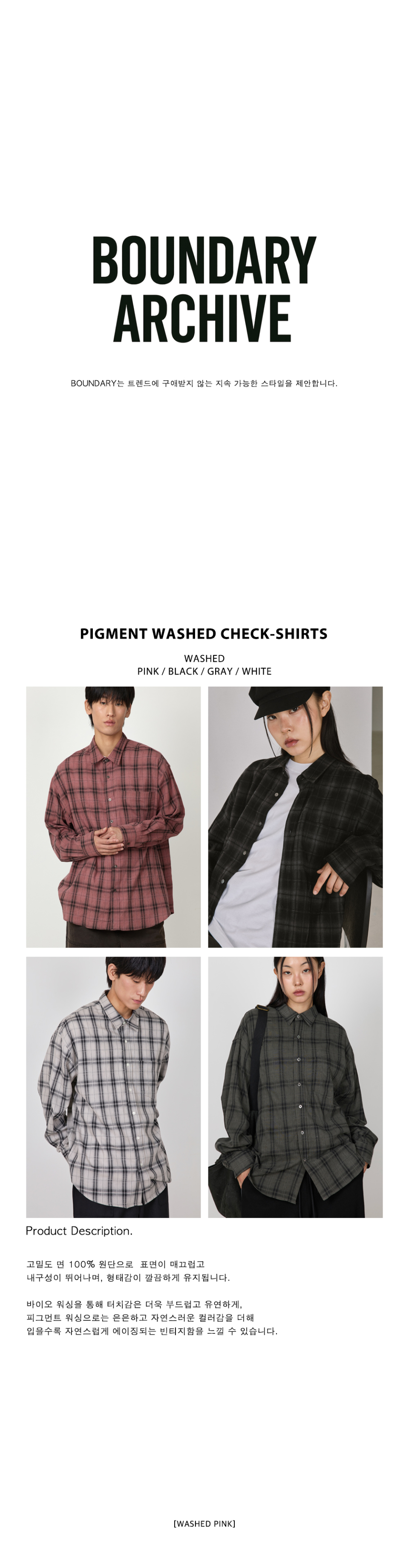 바운더리(BOUNDARY)는 현대인의 바쁜 일상 속에서도 놓칠 수 없는 깔끔한 실루엣과 색감 중심의 스타일을 추구하는 타임리스 브랜드입니다.