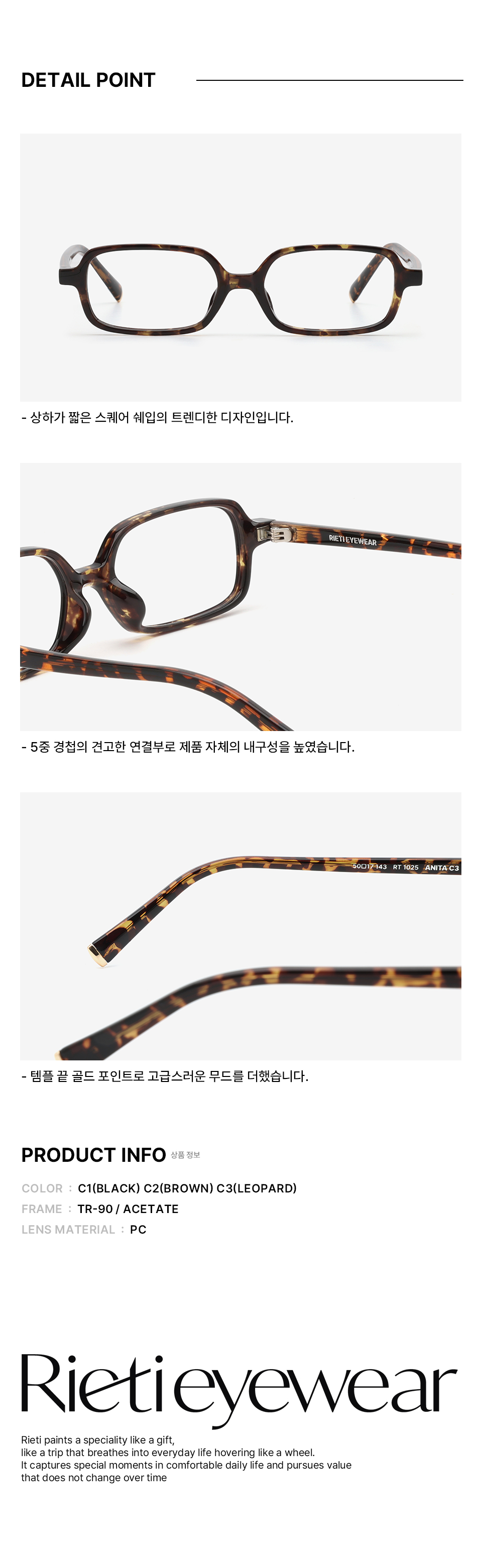 리에티(RIETI)는 아이웨어의 본질적 가치에 트렌디하고 편안한 무드를 더해 매 시즌 지속 가능한, 합리적인 아이템을 선보이는 브랜드입니다.