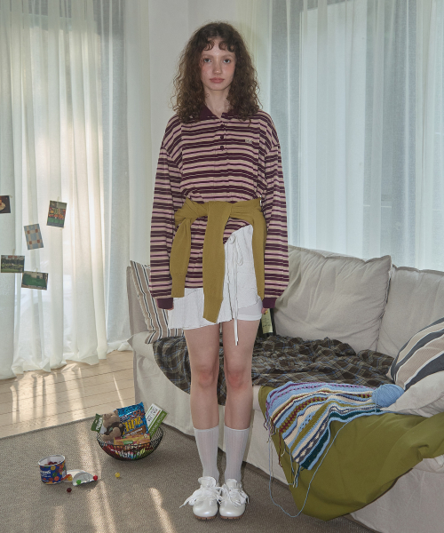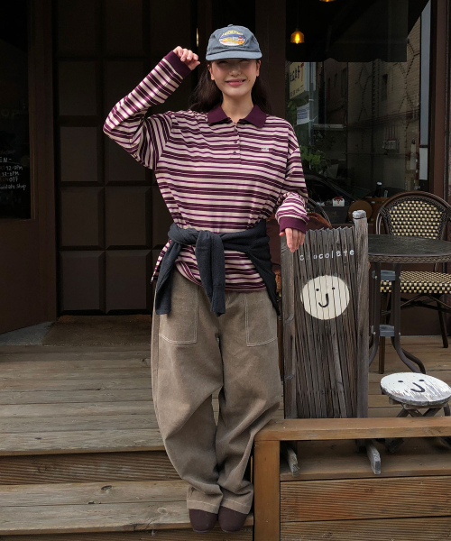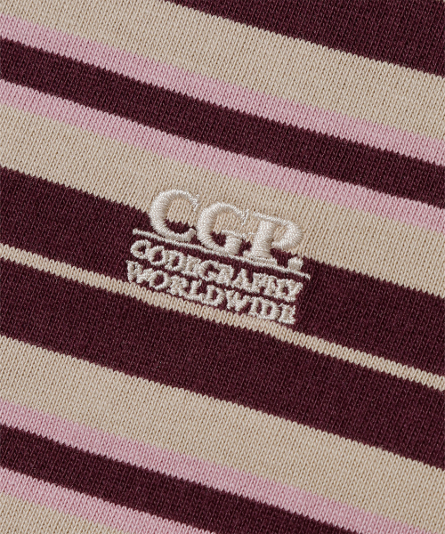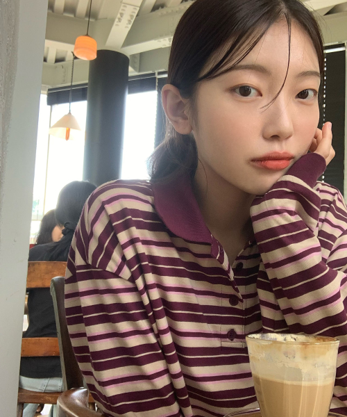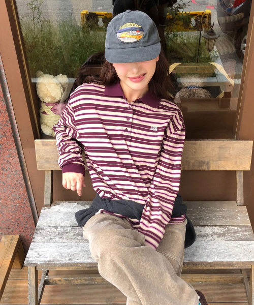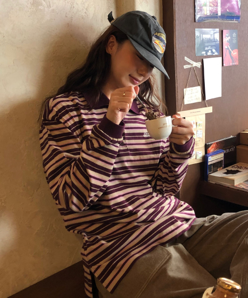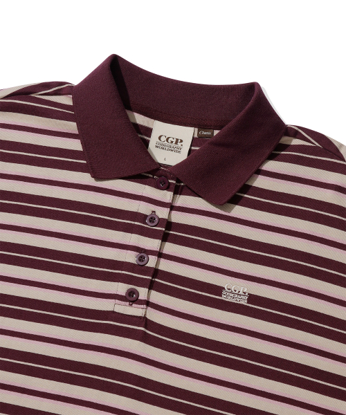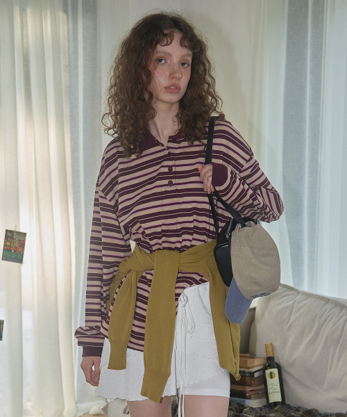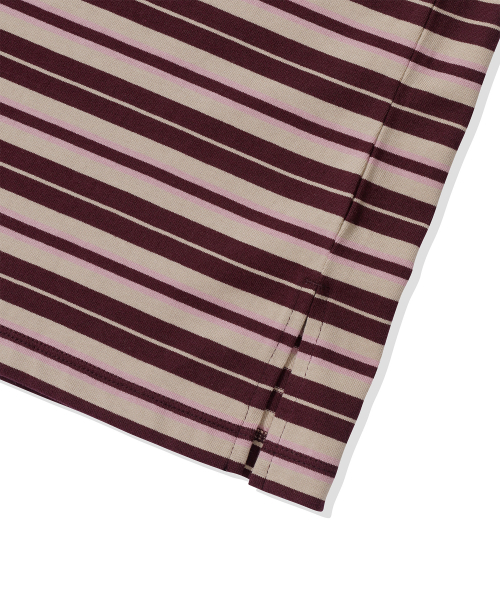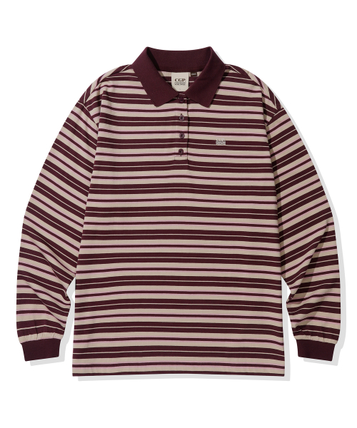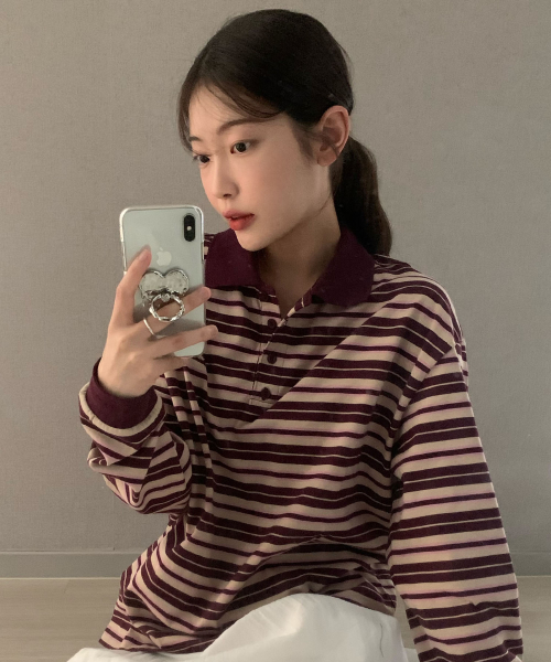 (우먼) 스트라이프 카라 롱슬리브_버건디