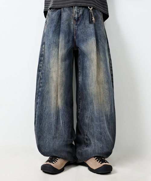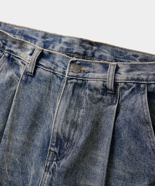 원턱 커브드 크리즈 워싱 와이드 데님 팬츠_슬럽 딥 인디고
