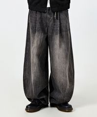 원턱 커브드 크리즈 워싱 와이드 데님 팬츠_슬럽 블랙