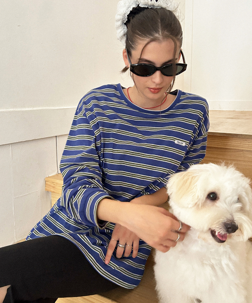 아이비 스트라이프 라운드 롱슬리브 티셔츠 핑크