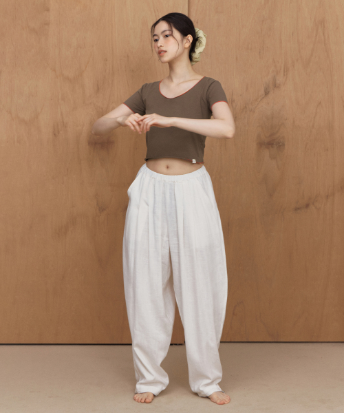 전체적으로 넉넉한 핏에 깊은 핀턱이 잡혀 있어 풍성한 볼륨감을 주며, 밑단에는 스트링 디테일로 다양한 실루엣을 완성합니다.