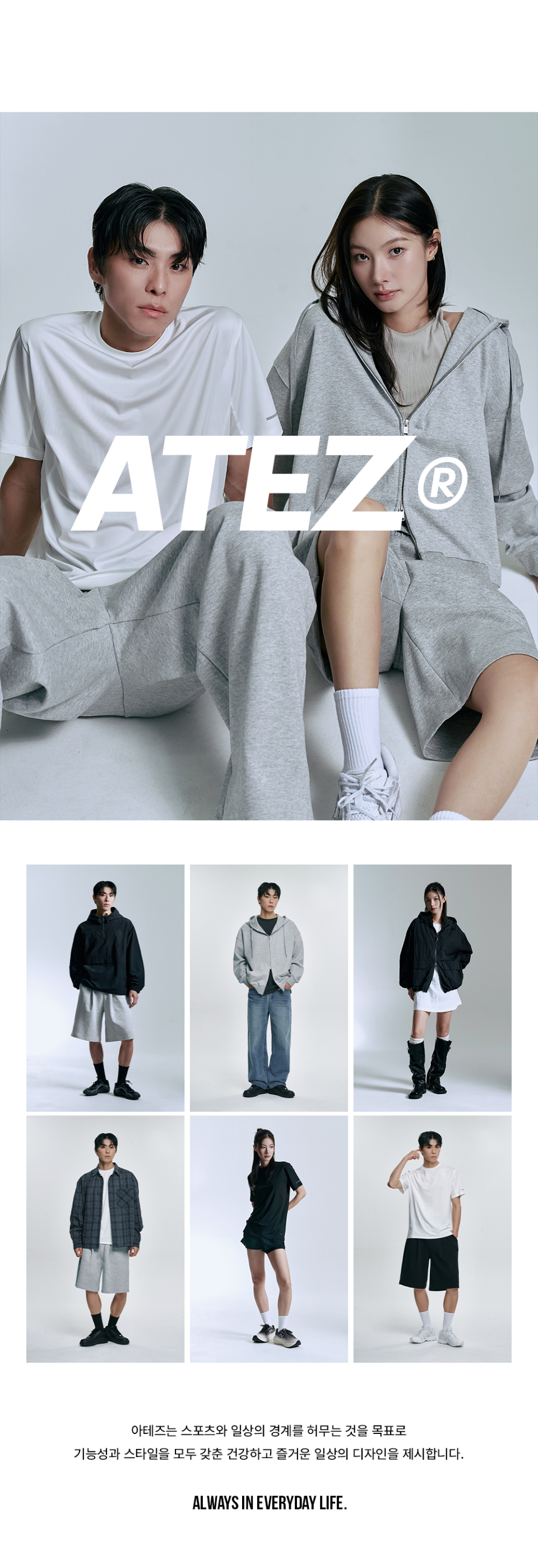 아테즈(ATEZ)는 일상 속 운동을 포함한 모든 활동에서 착용할 수 있는 다양한 라인을 선보이며 스포츠와 일상의 경계를 허무는 것을 목표로, 기능성과 스타일을 모두 갖춘 건강하고 즐거운 일상의 디자인을 제시하는 브랜드입니다.