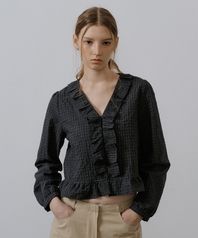 Ruffle v-neck check blouse [FRSP05BL01]_Charcoal