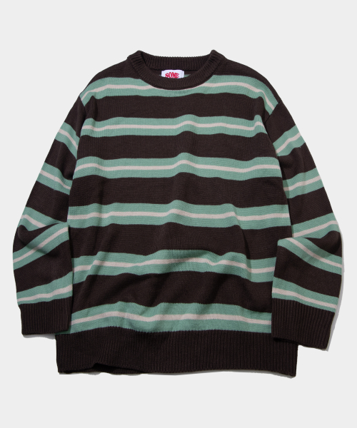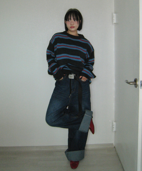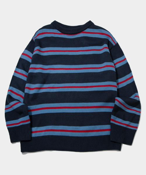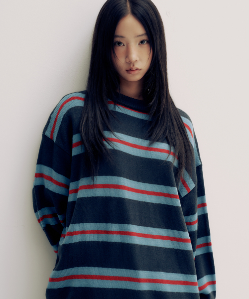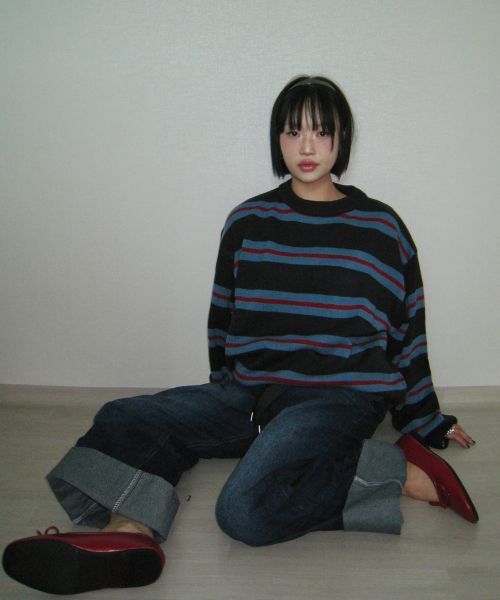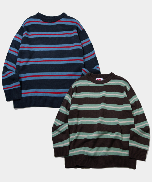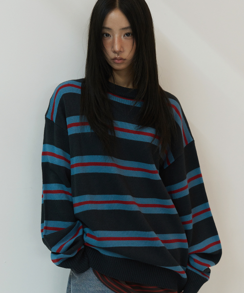 캐주얼 멀티 라운드넥 배색 스트라이프 오버핏 니트 _ 2COLOR