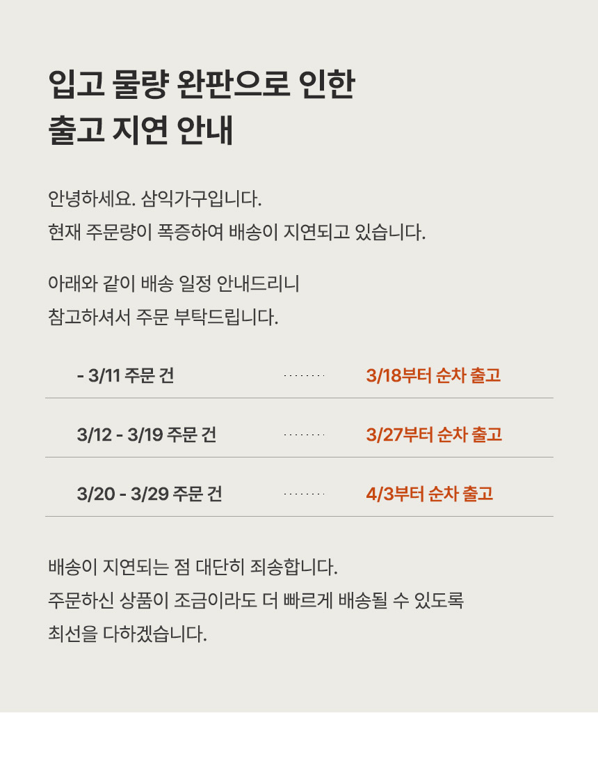 삼익가구(SAMICK)는 라이프스타일에 따른 공간의 가치 향상을 목표로 우수한 품질과 합리적인 가격, 차별화된 배송 시스템으로 고객 가치를 극대화하는 가구 유통 기업입니다.