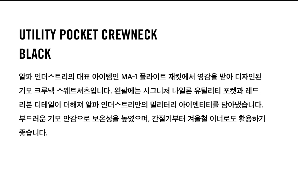 알파 인더스트리(ALPHA INDUSTRIES)는 1959년 테네시주 녹스빌의 한 공장에서 시작한 브랜드입니다. 미국의 육·해·공군 및 해병대원을 보호하는 플라이트 재킷이나 코트를 제공하는 공식 공급업체(오피셜 서플라이어)로 엄격한 밀스펙(군대에서 정해 놓은 기준)을 엄수하며 생산합니다. 특히 알파 인더스트리는 다른 업체와 달리 군수품과 일반인에게 판매되는 재킷에 등급의 차이가 없습니다. 알파 인더스트리의 제품은 미국은 물론 전 세계 각지의 미군 기지에서 활동하는 군인이나 파일럿, 지상 요원이 입는 재킷과 같은 그레이드의 아이템입니다.