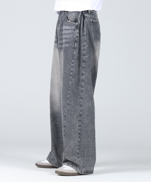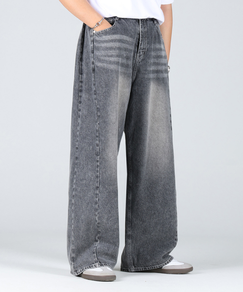 사이드 핀턱 블러 워싱 와이드 데님 팬츠_Grey