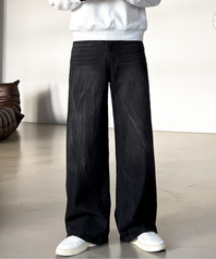 크랙 워싱 와이드 데님팬츠 커브드 청바지_블랙