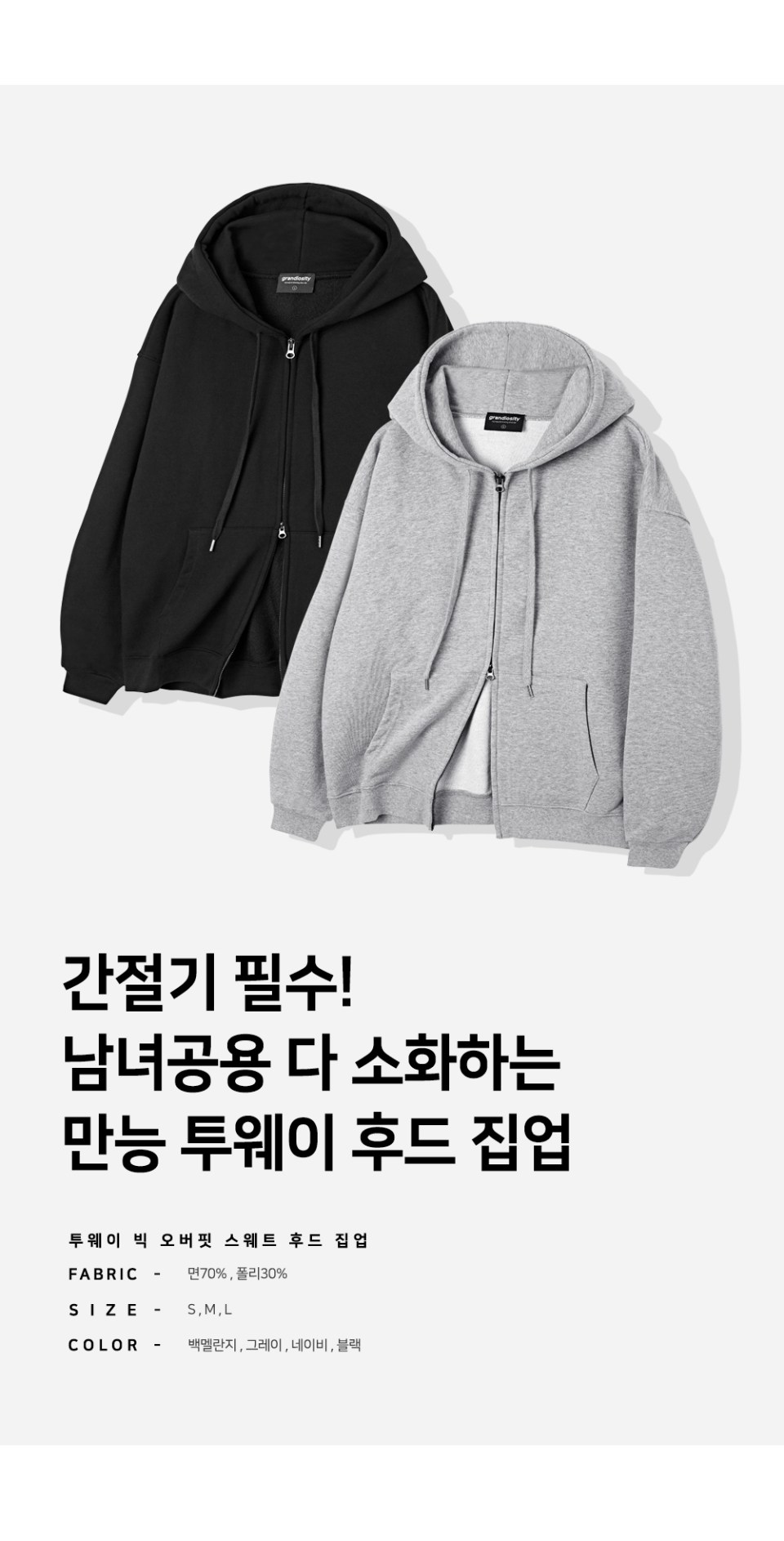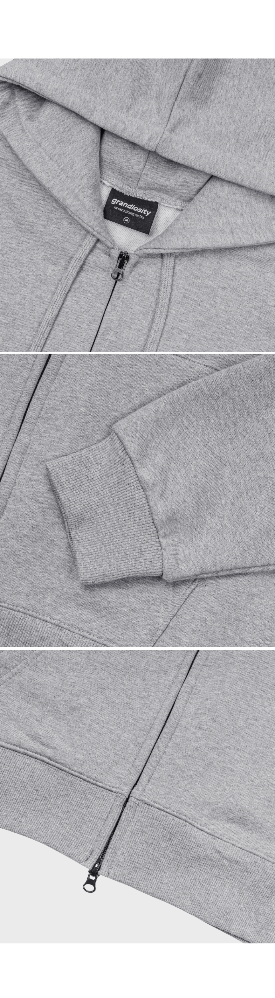 그랜디오시티(GRANDIOSITY)는 '자신을 실제보다 위대하고 소중한 존재로 생각하는'의 뜻을 가졌으며, 자신만의 방식으로 개성을 드러낼 수 있는 다양한 스타일을 제안하는 브랜드입니다.