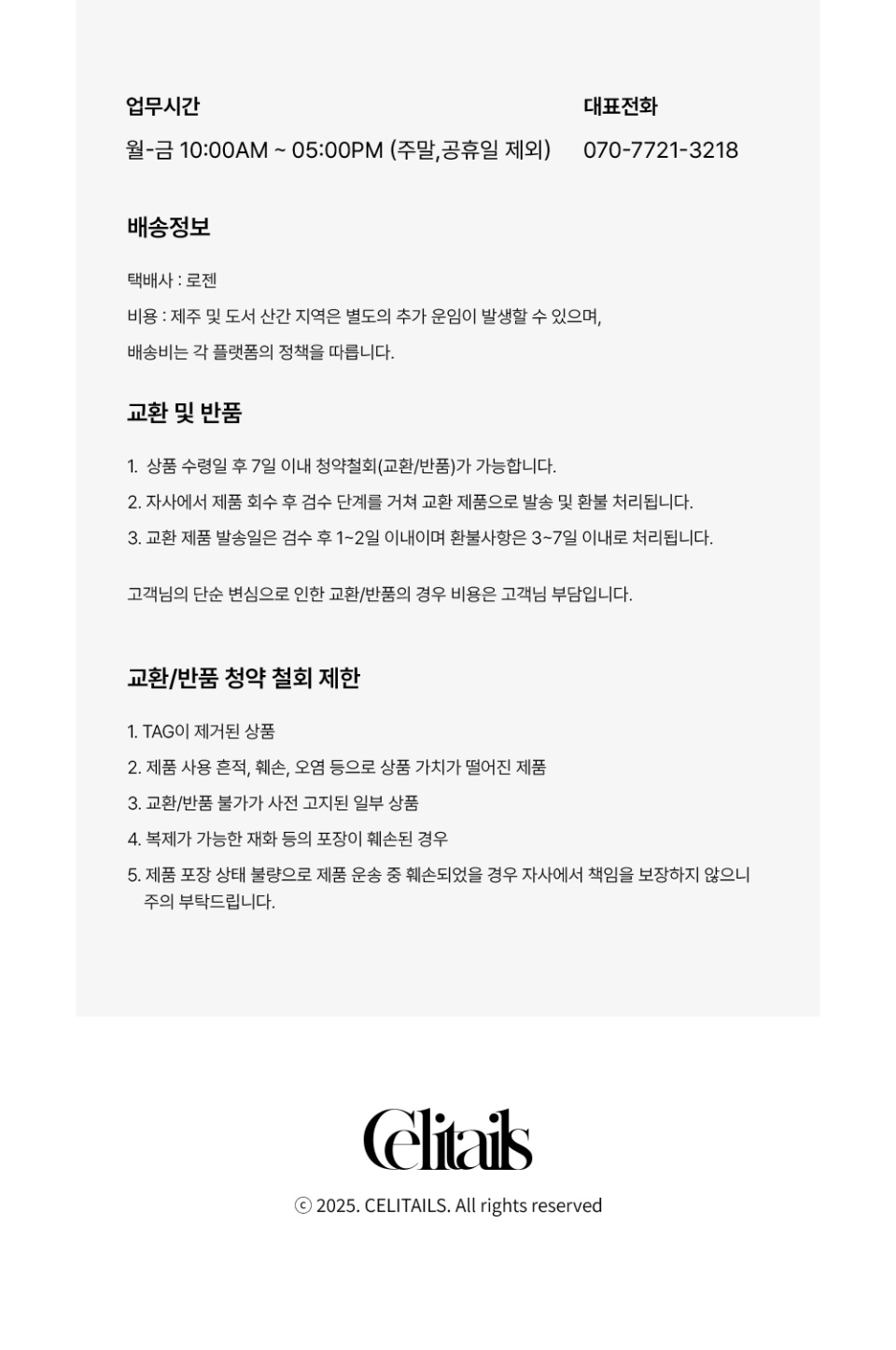 셀리테일즈(CELITAILS)는 러블리한 무드에 로맨틱한 디테일을 더해, 감각적인 실루엣과 다채로운 컬러로 일상에 설렘과 특별함을 전하는 브랜드입니다.