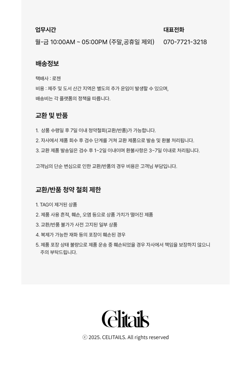 셀리테일즈(CELITAILS)는 러블리한 무드에 로맨틱한 디테일을 더해, 감각적인 실루엣과 다채로운 컬러로 일상에 설렘과 특별함을 전하는 브랜드입니다.