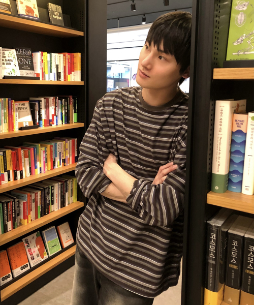 오버핏 스트라이프 롱슬리브 티셔츠 차콜
