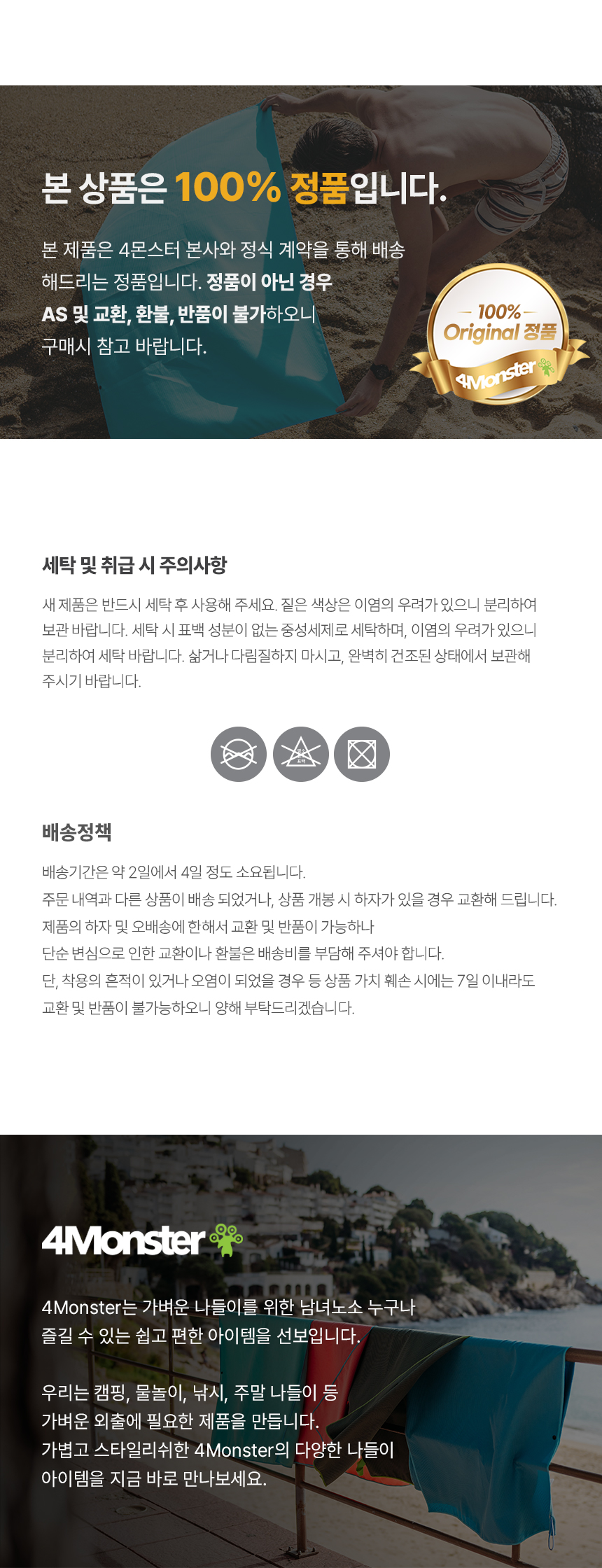 4몬스터(4MONSTER)는 ‘Ultra Light, Portable, Ready to Go’를 모토로, 당신의 가벼운 일상을 위해 남녀노소 누구나 즐길 수 있는 레저&아웃도어 라이프스타일 아이템을 선보입니다.