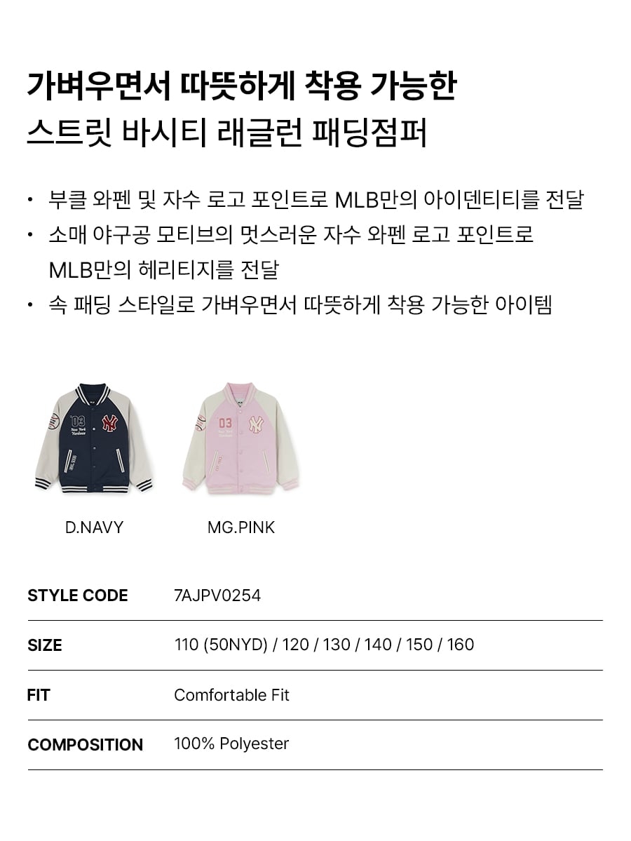 컬러: D.Navy상품명: STREET 바시티 래글런 패딩점퍼소재: 겉감1 폴리에스터100% 겉감2 폴리에스터100% 배색 폴리에스터97% 배색 폴리우레탄3% 안감1 나일론100% 안감2 폴리에스터100% 충전재 폴리에스터100%품번: 7AJPV0254-50NYD