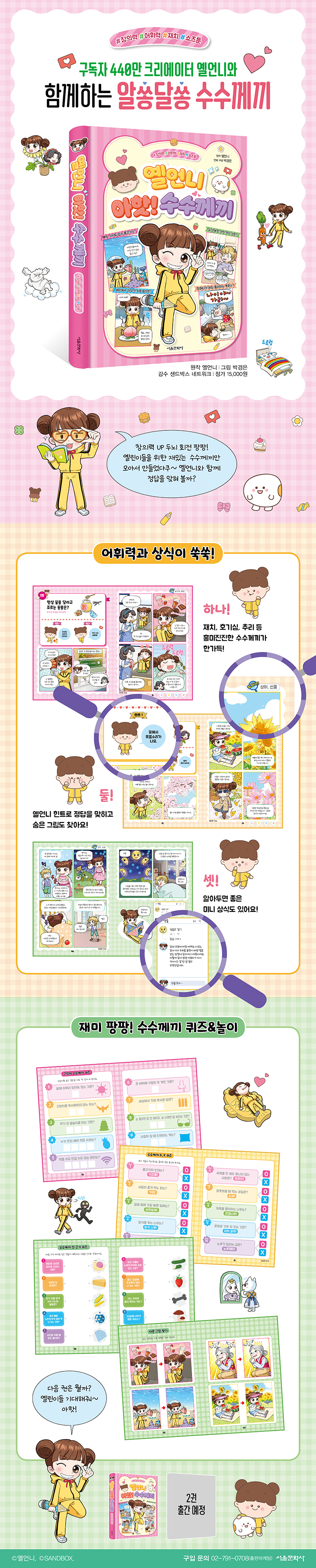 심심할 틈이 없는 웃음, 감동 가득한 옐언니의 첫 수수께끼 쇼츠툰이 찾아왔어요! 주제별 다양하고 흥미진진한 수수께끼와 어휘력과 상식이 쑥쑥 자라나는 수수께끼가 총집합! 긍정파워 엉뚱발랄 옐언니! 옐언니를 좋아하는 장난꾸러기 원준, 모두의 왕자님 현우, 옐언니의 베스트 프렌드 지희까지 옐언니와 친구들이 만난 알쏭달쏭 수수께끼를 함께 풀어 보아요. 알아두면 좋은 미니 상식도 한가득이니 수수께끼를 풀며 답을 찾아가는 과정을 통해 재미있게 어휘력과 사고력을 키워 보아요!