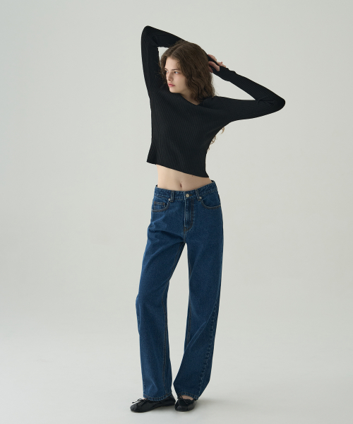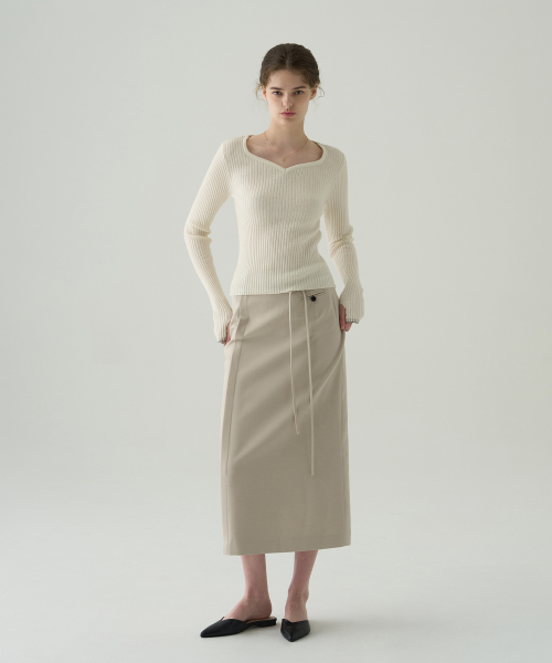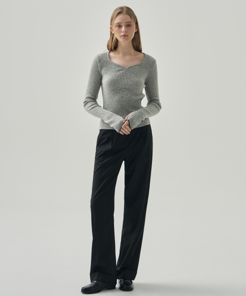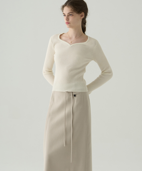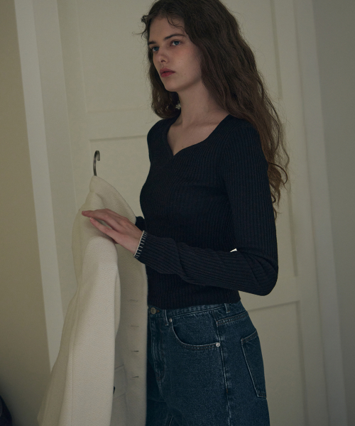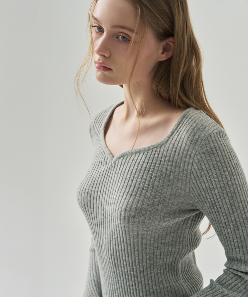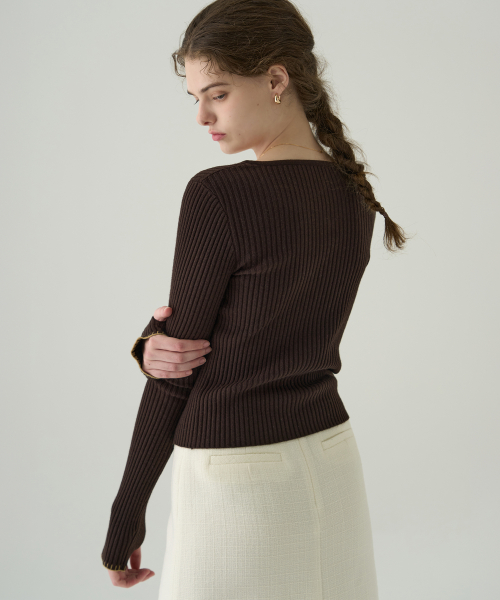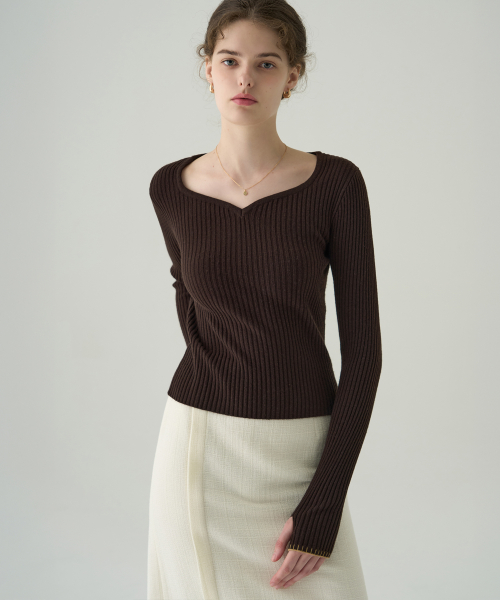 하트 넥 골지 슬림 니트 탑 [BROWN]
