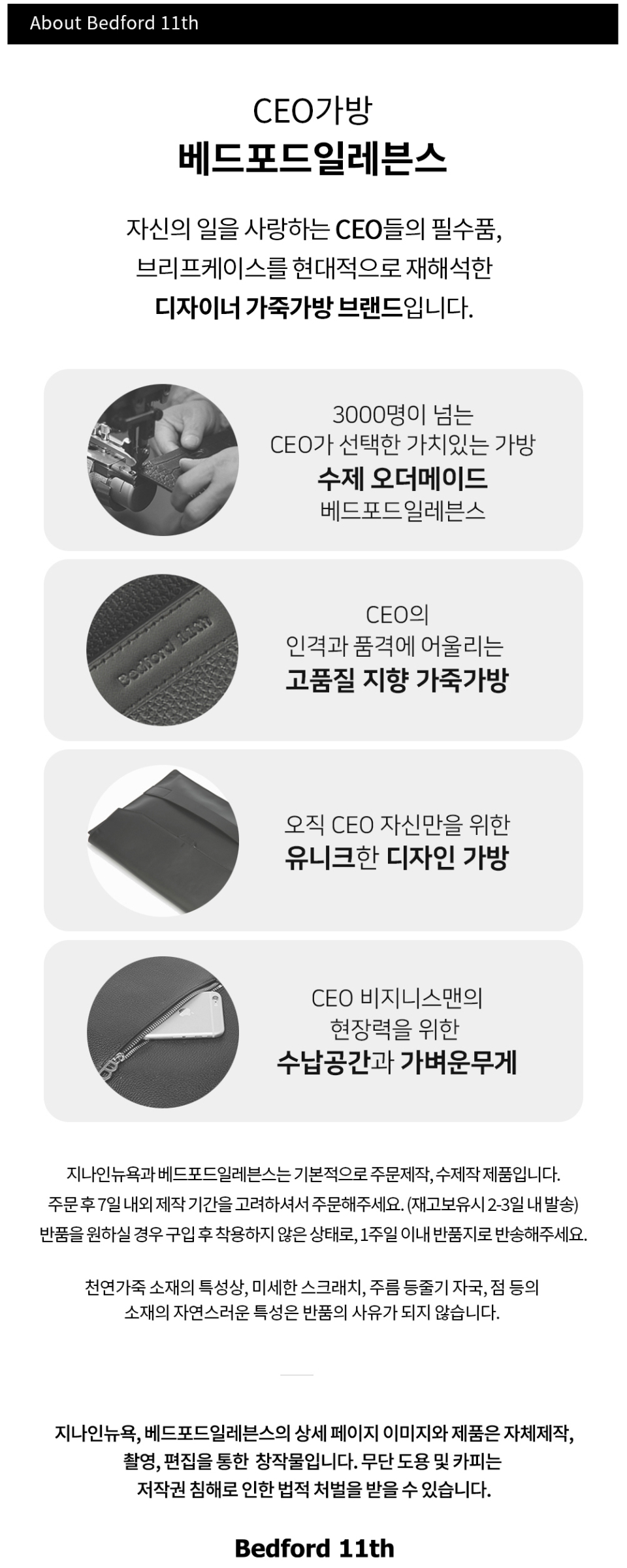 BEDFORD11TH(베드포드일레븐스)는 창의적인 예술감각이 넘치는 젊은이들의 감성을 바탕으로 만들어진 브랜드로, 기존의 서류가방 위주의 남성 가방에서 탈피, 여성가죽가방의 디테일과 소재를 남성가방에 접목하여 , 새로운 컨셉의 bag을 추구하는 고급스럽고 심플한 캐릭터 있는 가죽가방브랜드입니다.