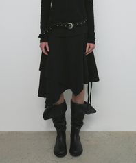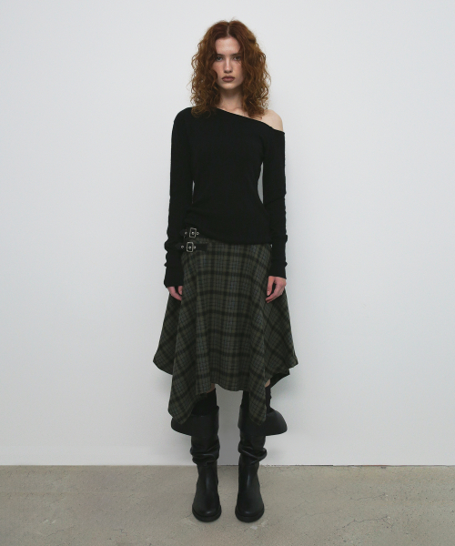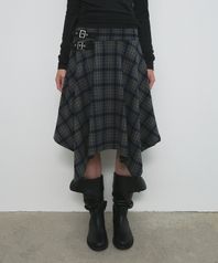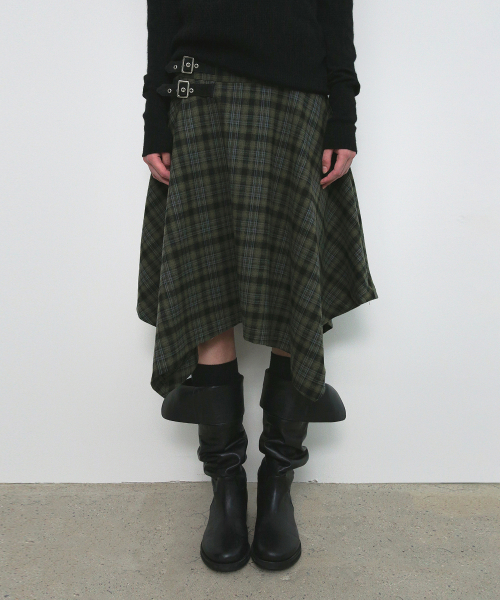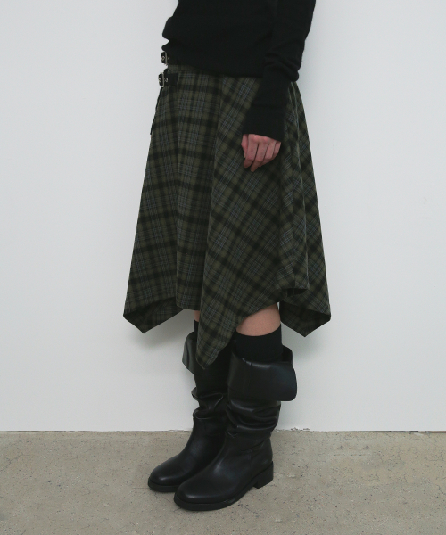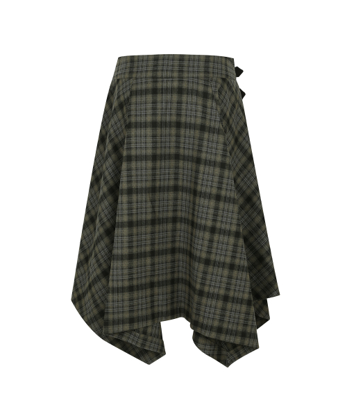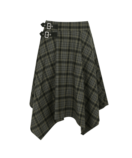 CHECK UNBALANCED MIDI SKIRT_KHAKI
