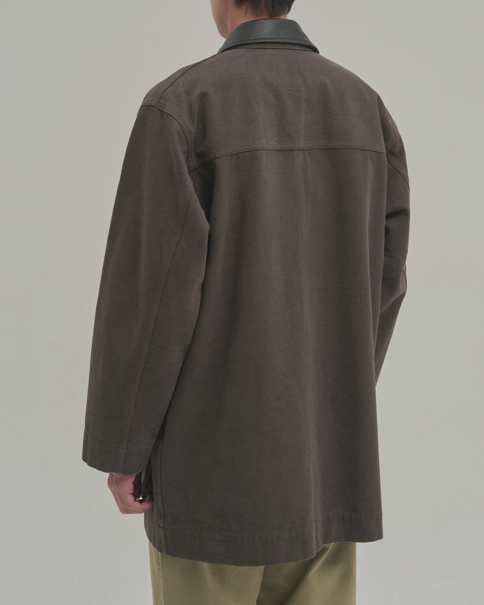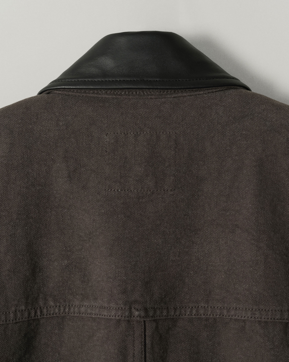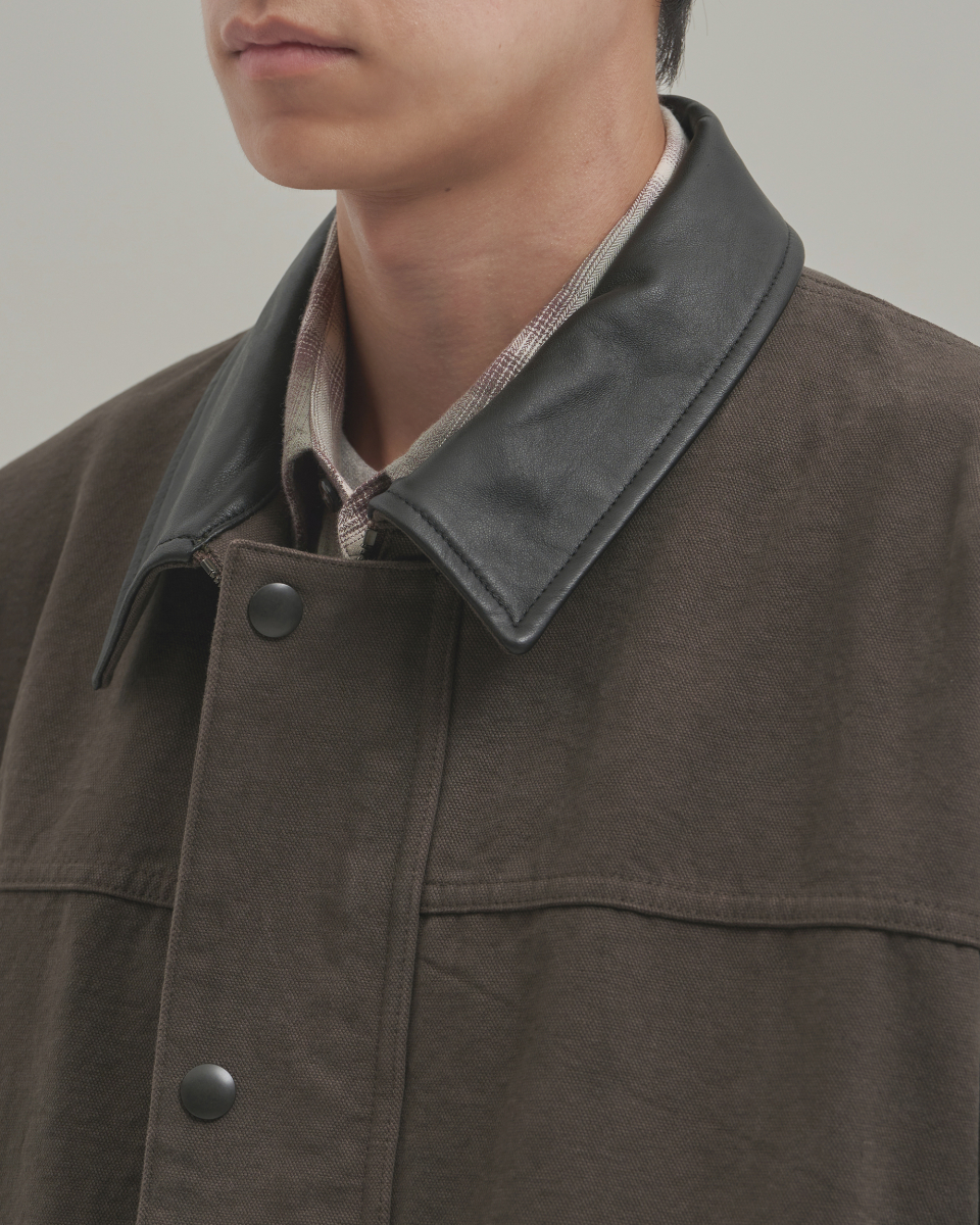 칼라 부분에는 램 스킨 레더를 트리밍하여 텍스쳐의 대비와 함께 구조적 포인트를 더했으며 전면부 여밈은 스냅 버튼과 YKK사의 최상위 엑셀라 2웨이 지퍼를 함께 사용하여 단단하면서도 부드럽게 여밀 수 있습니다.