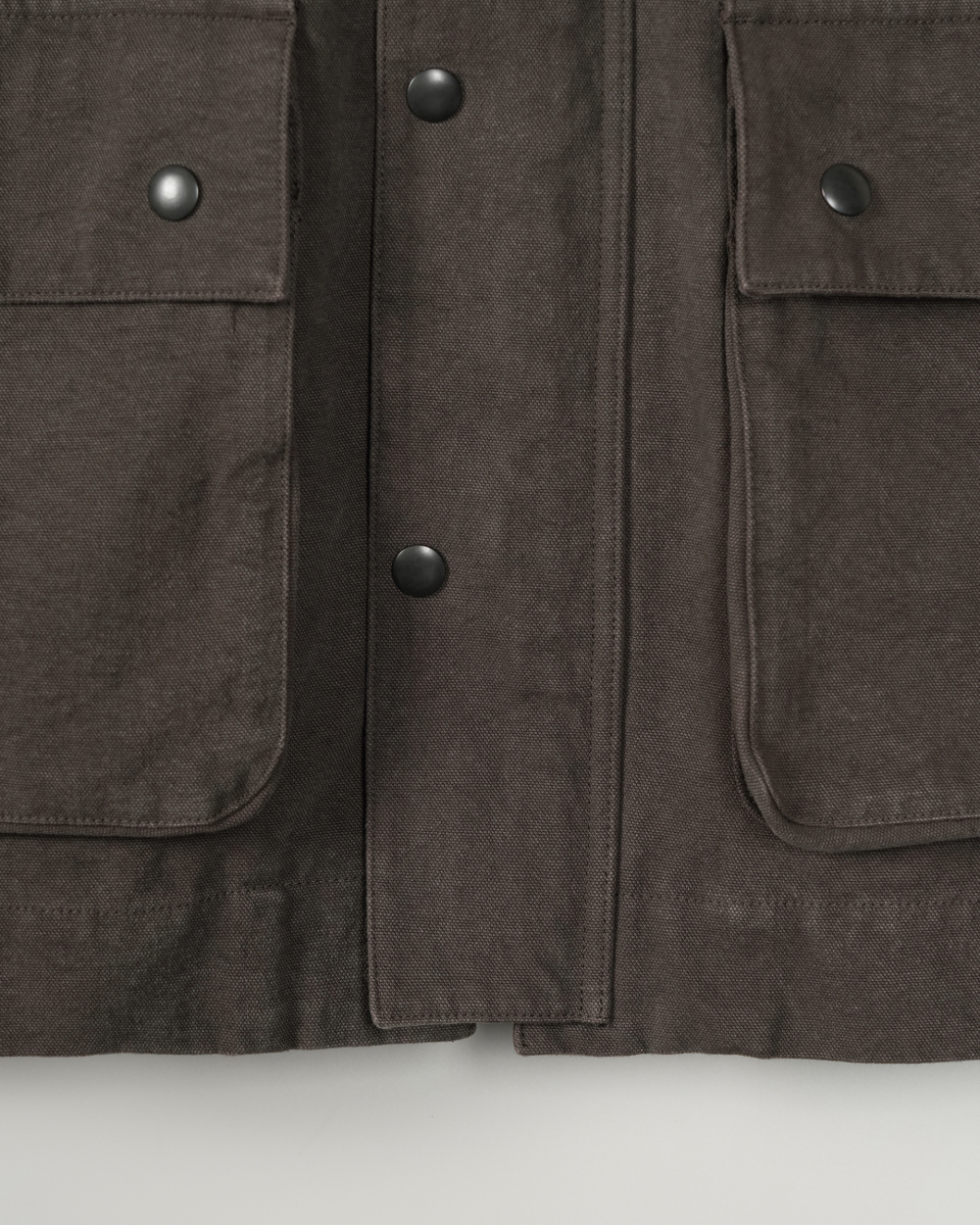 디자인적으로는 가슴 부분의 요크 절개 라인과 상단 웰트 포켓, 하단의 플랩 패치 포켓이 조화를 이루며 구조감과 실용성을 함께 고려한 입체적 구성이 돋보입니다.