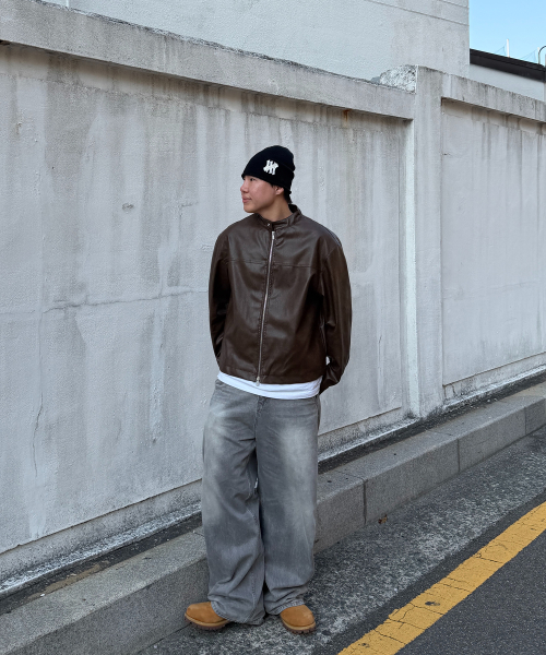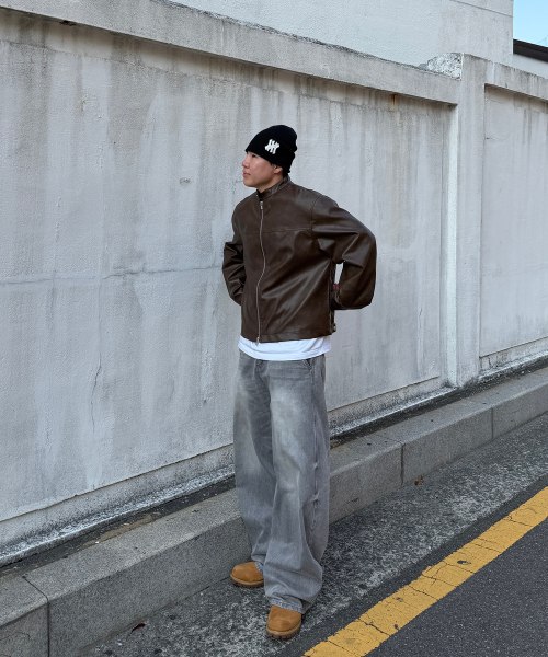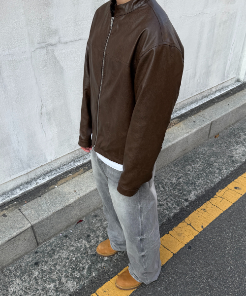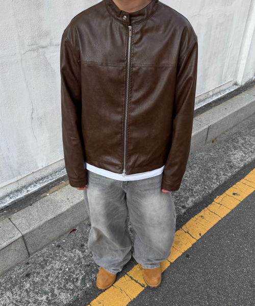 오버핏 미니멀 레이싱 바이커 블루종 레더 자켓 [브라운]