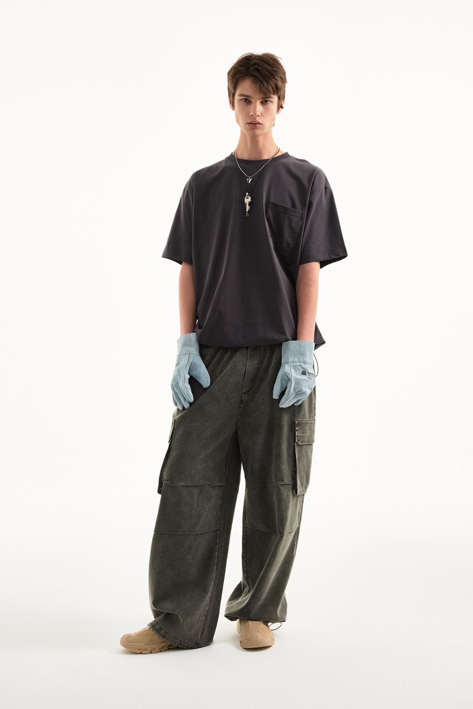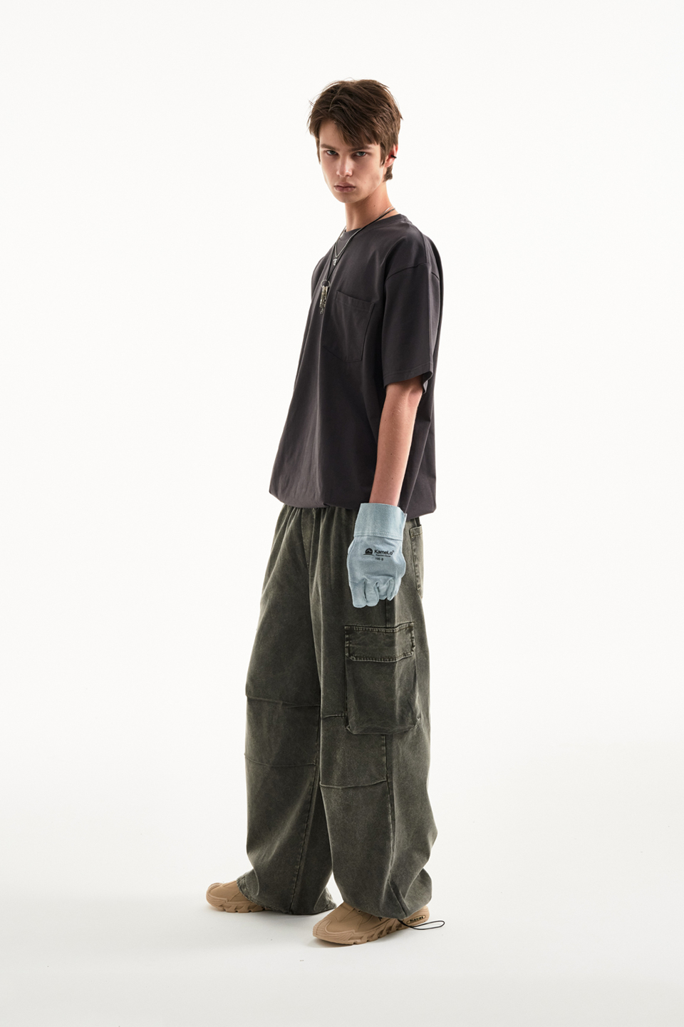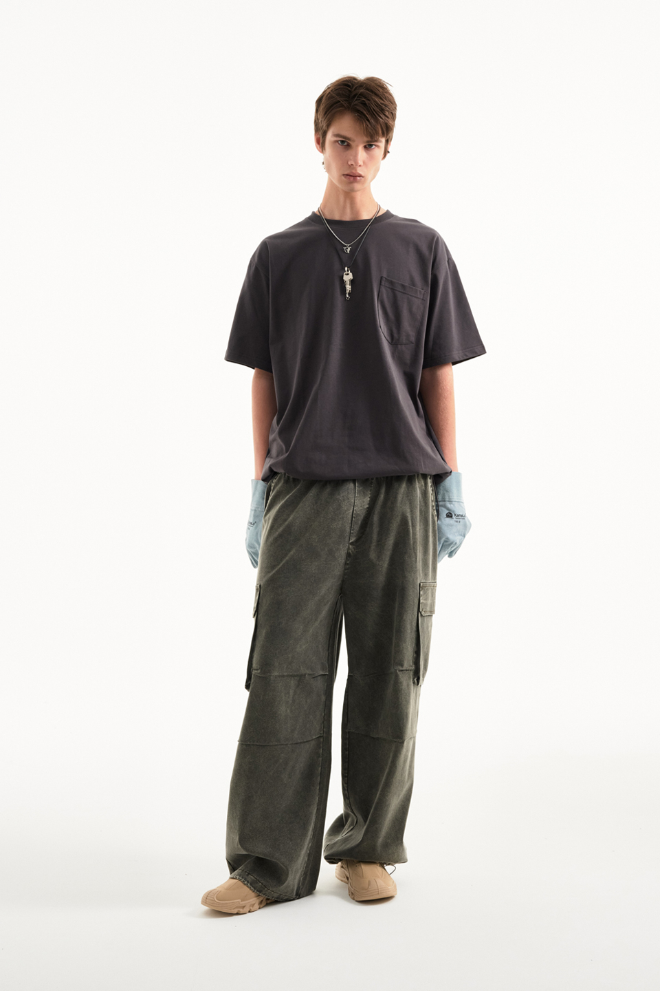 워싱 카고 밴딩 와이드 팬츠 [카키]
