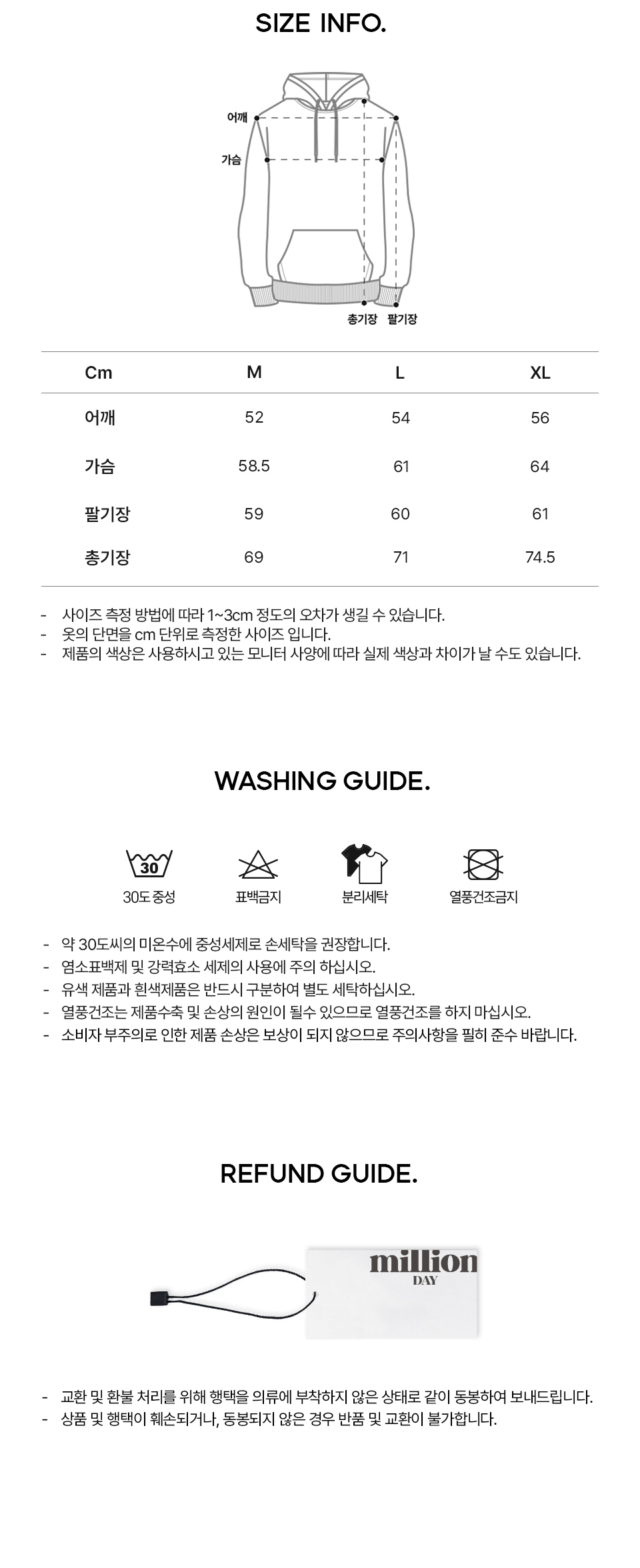 밀리언데이(MILLION DAY)는 'Anything can happen in a day(하루 안에 그 어떤 일이든 일어날 수 있다)'라는 슬로건 아래 키치한 그래픽과 디자인, 로고 플레이를 바탕으로 20~30대를 타깃으로 한 영 캐주얼 브랜드입니다.