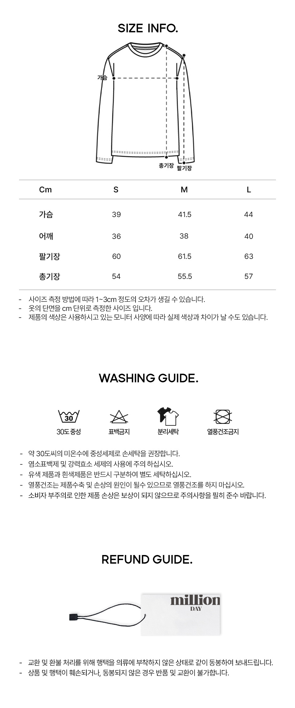 밀리언데이(MILLION DAY)는 'Anything can happen in a day(하루 안에 그 어떤 일이든 일어날 수 있다)'라는 슬로건 아래 키치한 그래픽과 디자인, 로고 플레이를 바탕으로 20~30대를 타깃으로 한 영 캐주얼 브랜드입니다.