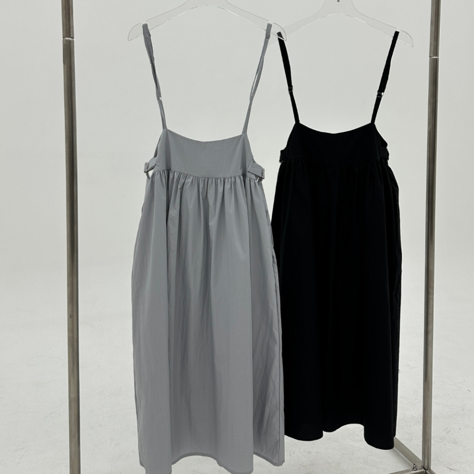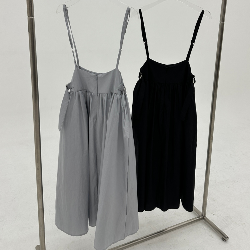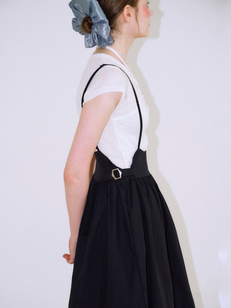 가벼운 텍스처 위로 구조적인 실루엣이 흐르는 플레어 원피스입니다.