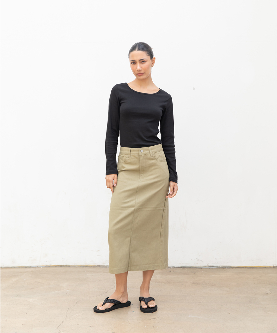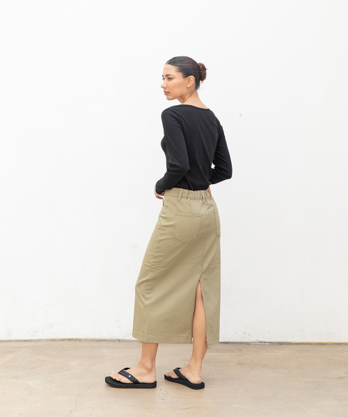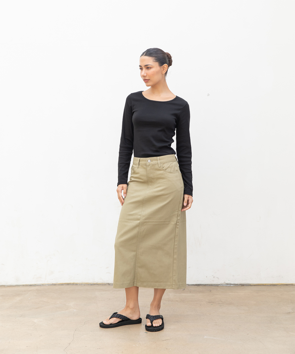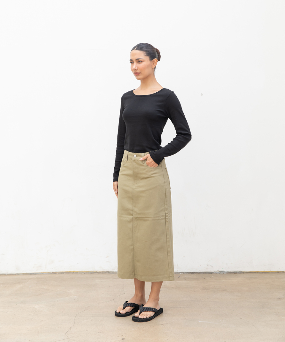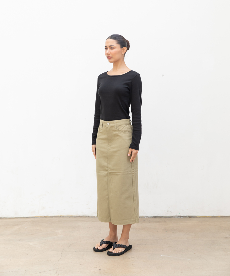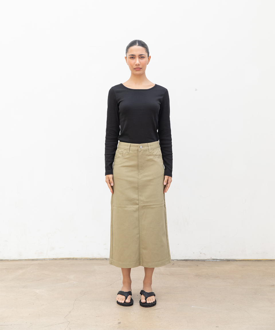 우먼즈 베이직 코튼 데님 롱 스커트[라이트카키]