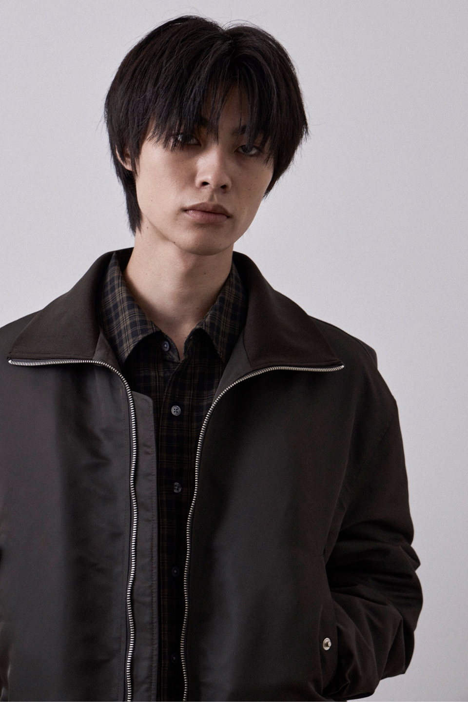 양쪽 가슴에 배치된 포켓 디테일과 자연스럽게 떨어지는 실루엣