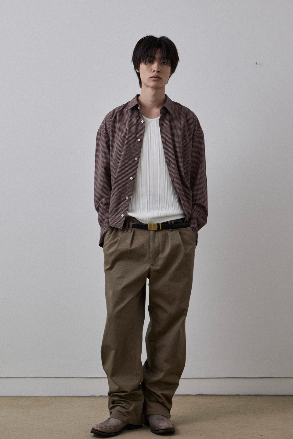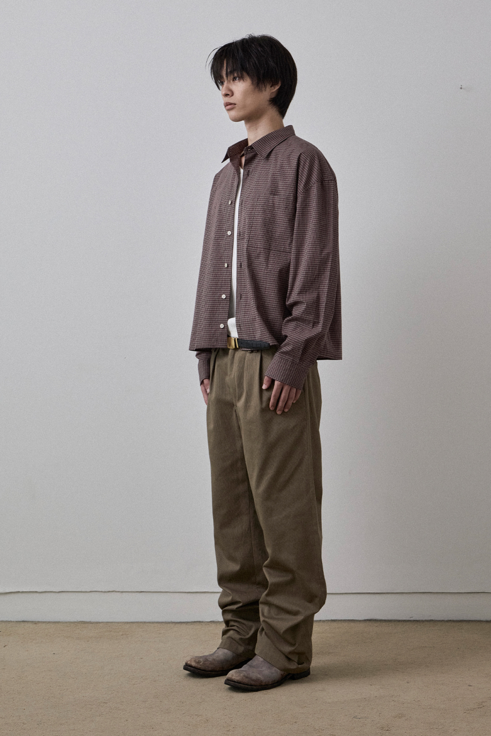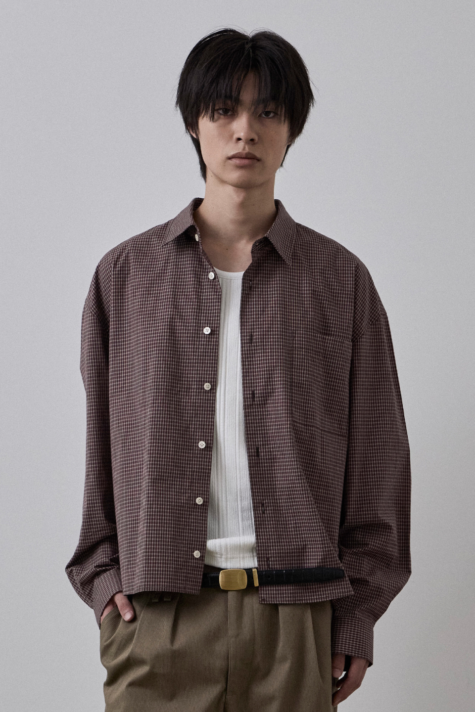 간결한 크롭 실루엣에 잔잔한 격자 구조의 미니멀 체크 패턴